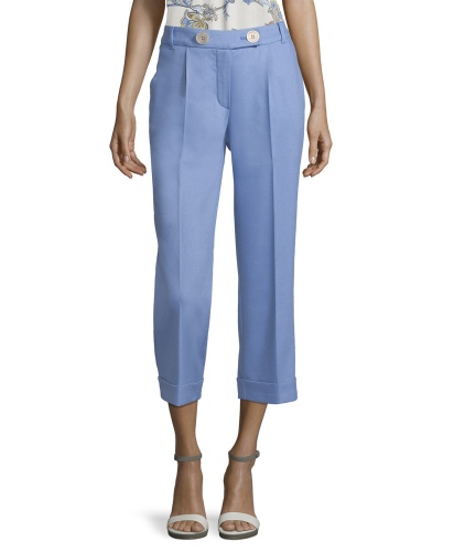Брюки прямого кроя со стрелками и манжетами. Длина 7/8 позволяет подчеркнуть модную обувь. Приятный к телу материал. Актуальный голубой цвет. Завершают стильный дизайн две крупные пуговицы на поясе. Эти брюки гарантируют трендовый образ в сочетании с любым верхом и обувью.
