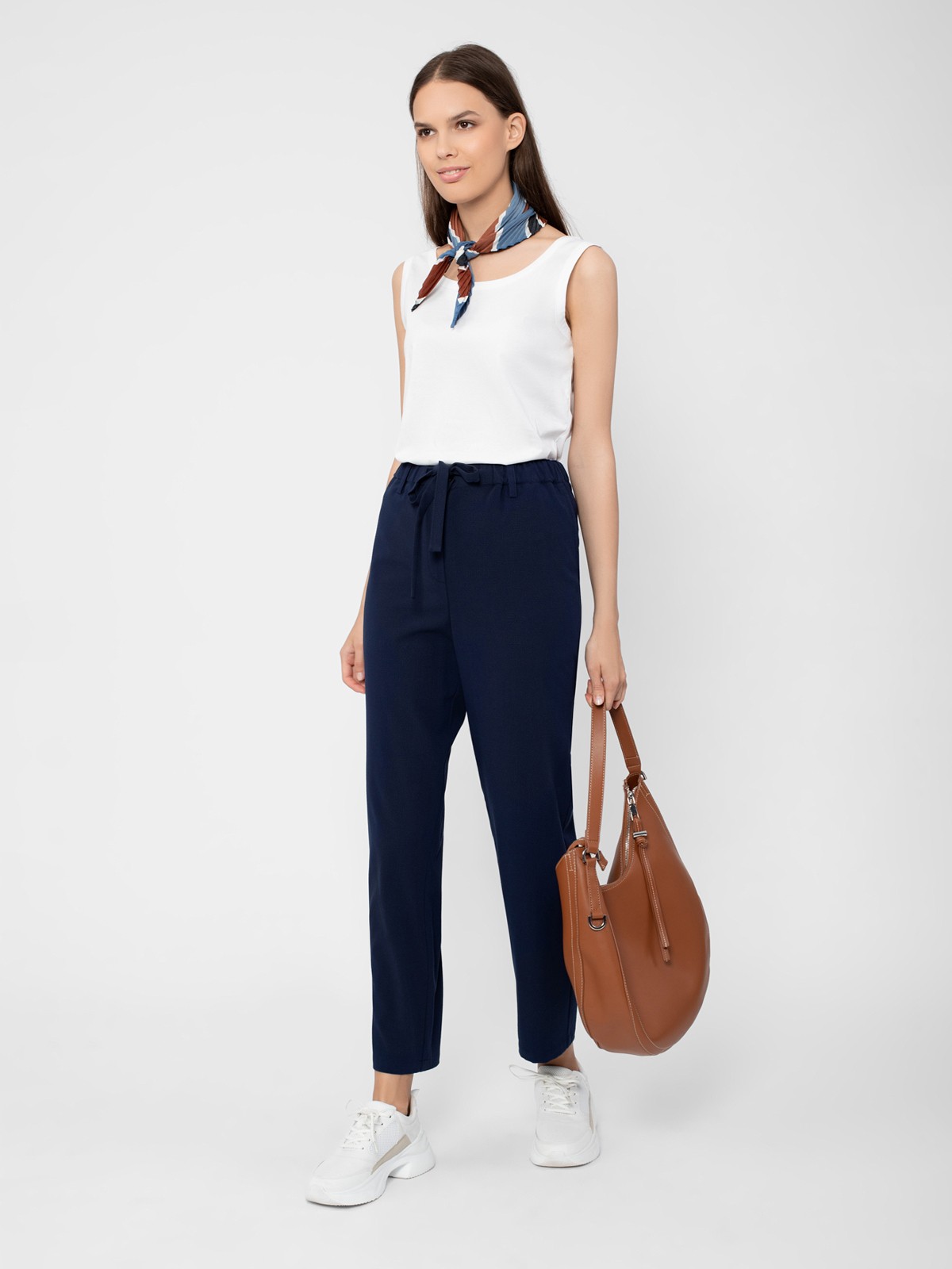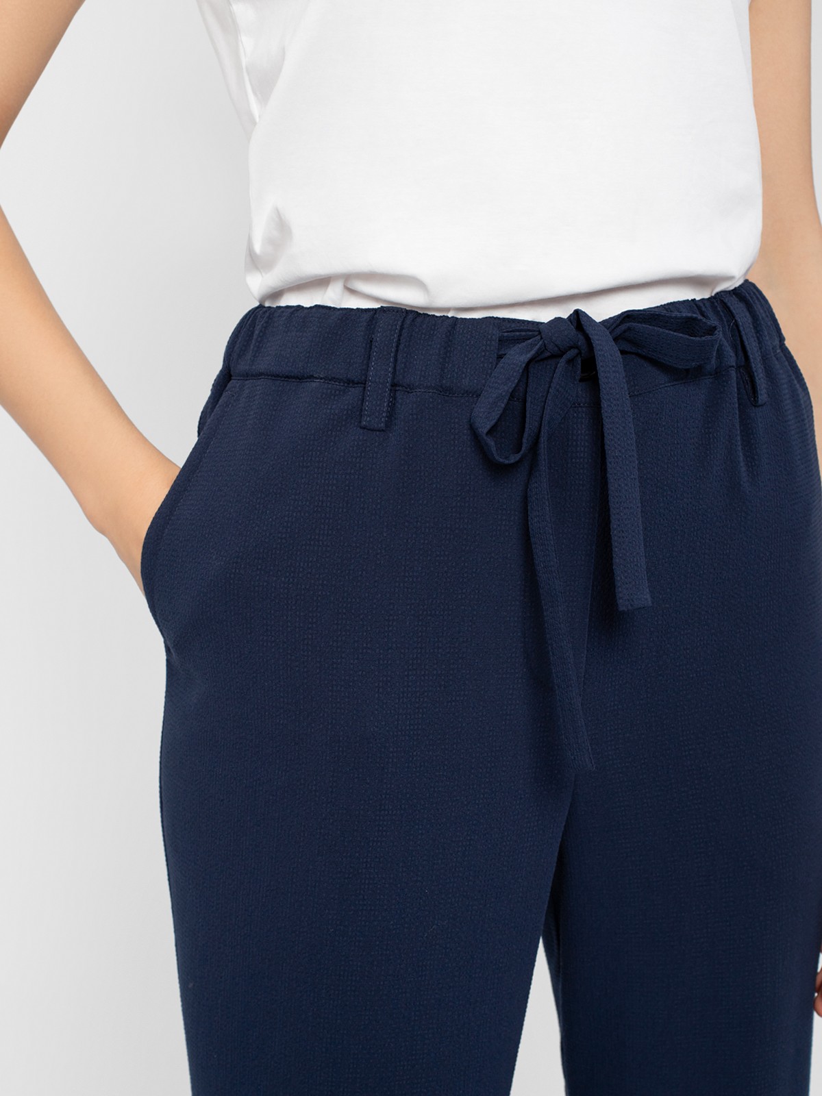 Брюки из фактурной ткани прямого силуэта на притачном поясе с резинкой, кулиской и завязками. Сзади крупные накладные карманы прямоугольной формы.