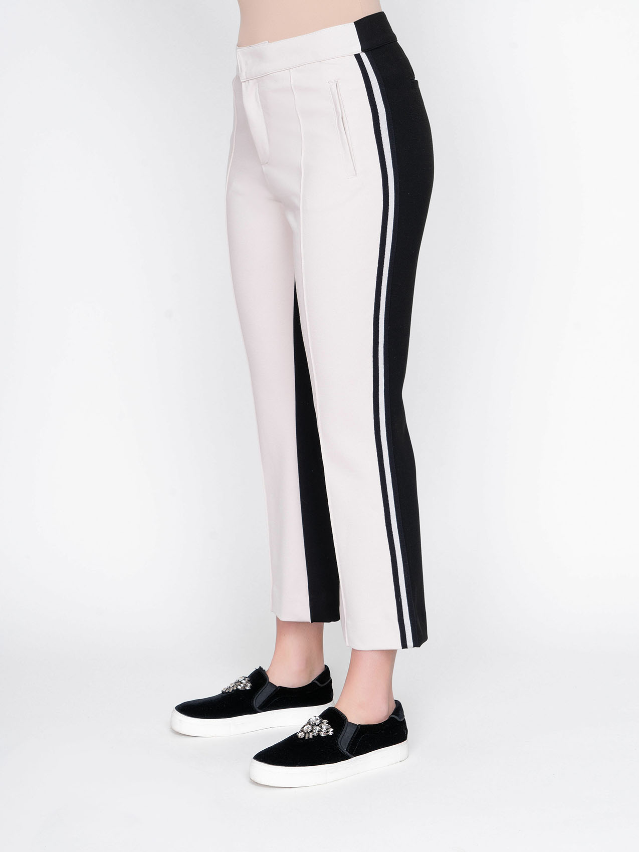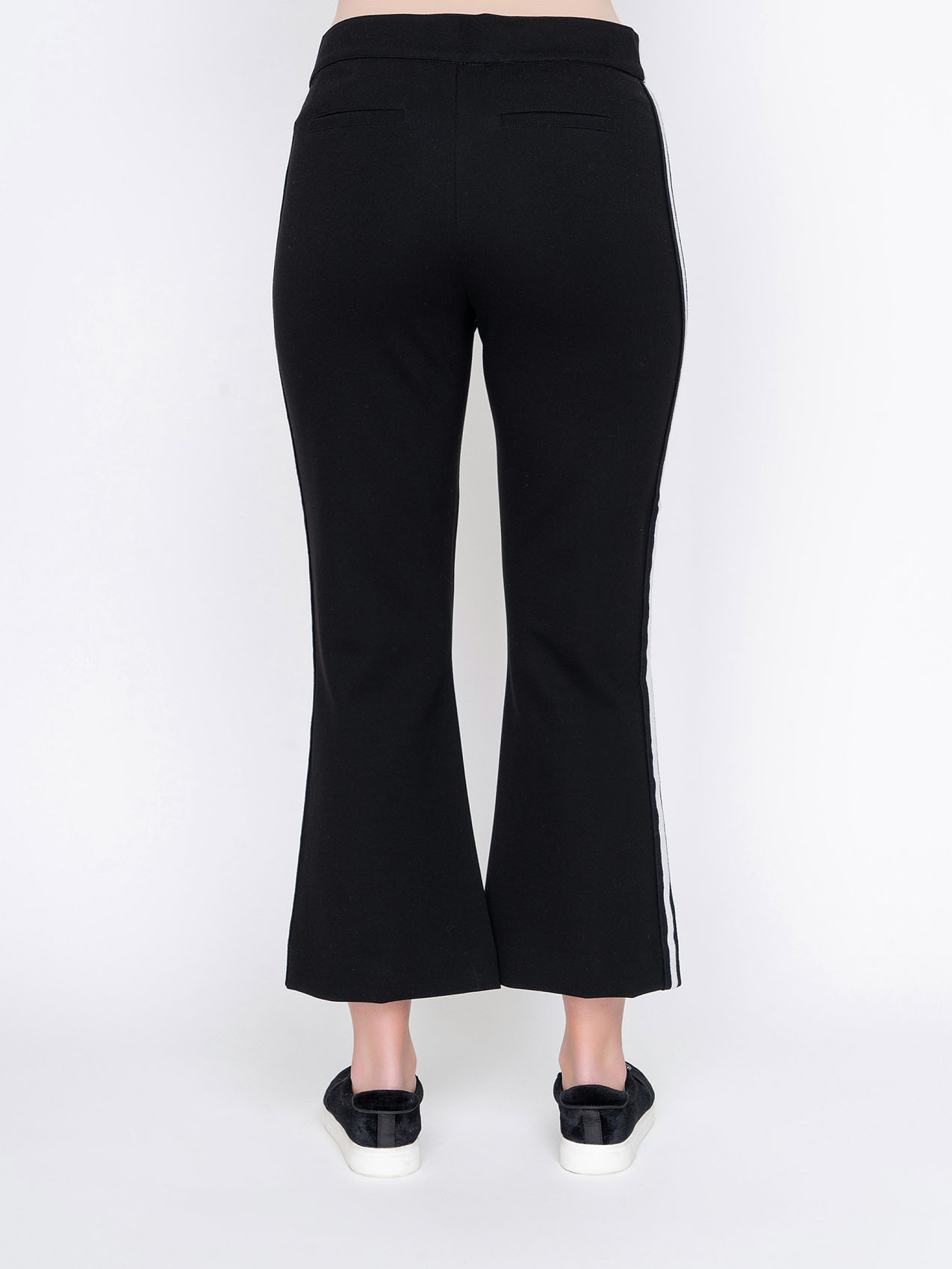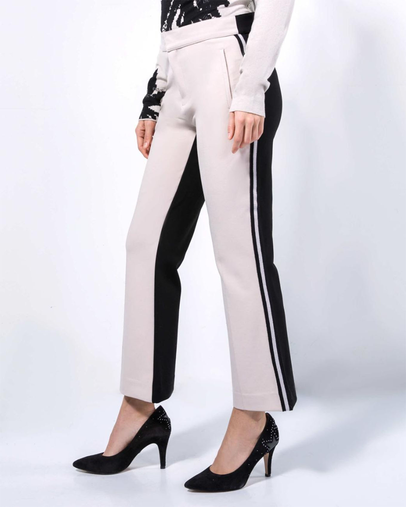 На сайте указаны Российские размеры. Брюки-клеш. Оригинальная двухцветная модель. Средняя посадка. Карманы с отрезным бочком. Длина брючин - 72 см.