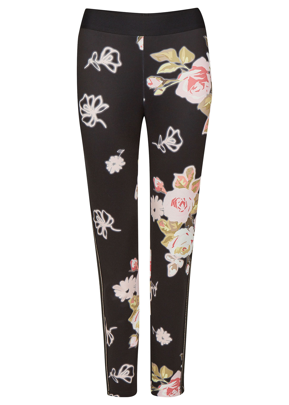 Брюки с цветочным принтом. Силуэт slim подчеркивает линию ног. Приятный к телу трикотаж. Декоративные ленты по бокам.