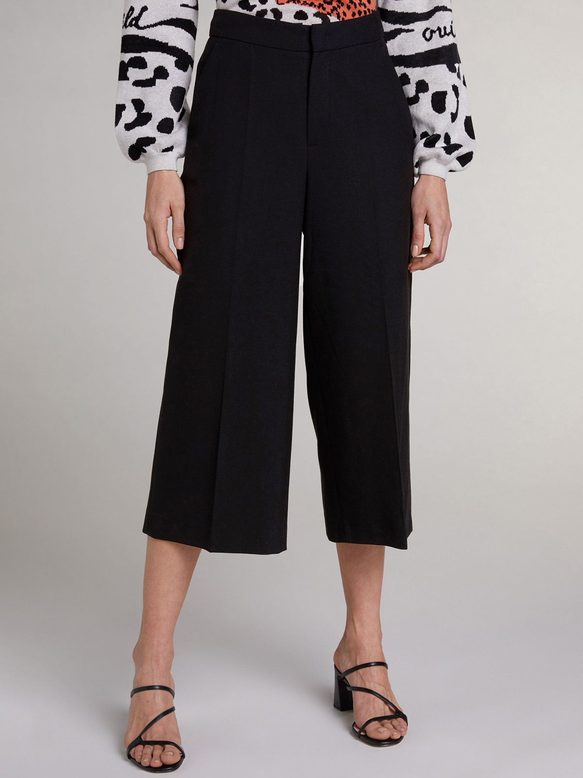 Кюлоты – бесспорный тренд этого сезона, прекрасно подходят как для делового, так и повседневного городского стиля. Комфортная высокая посадка. Застежка на скрытую молнию и крючок. Боковые внутренние карманы, прорезные карманы с листочкой сзади. Кюлоты можно надеть как с каблуком, так и с кроссовками.