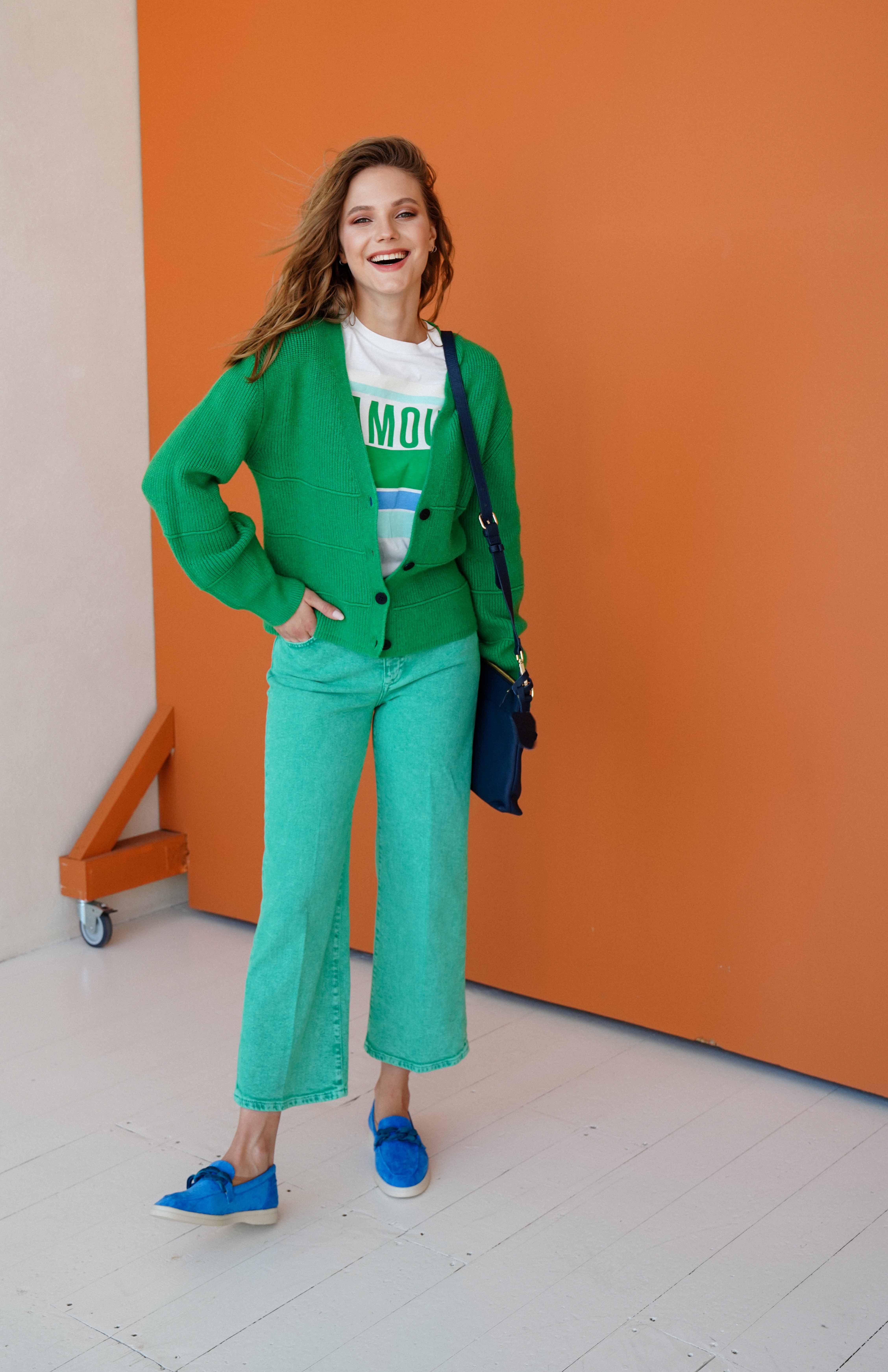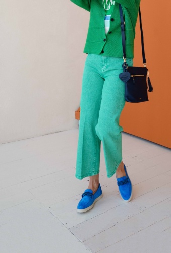 Джинсовые брюки нестандартного цвета точно выделят вас из толпы. Укороченные джинсы с высокой посадкой на талии. Застежка на молнии и пуговице. Боковые карманы.