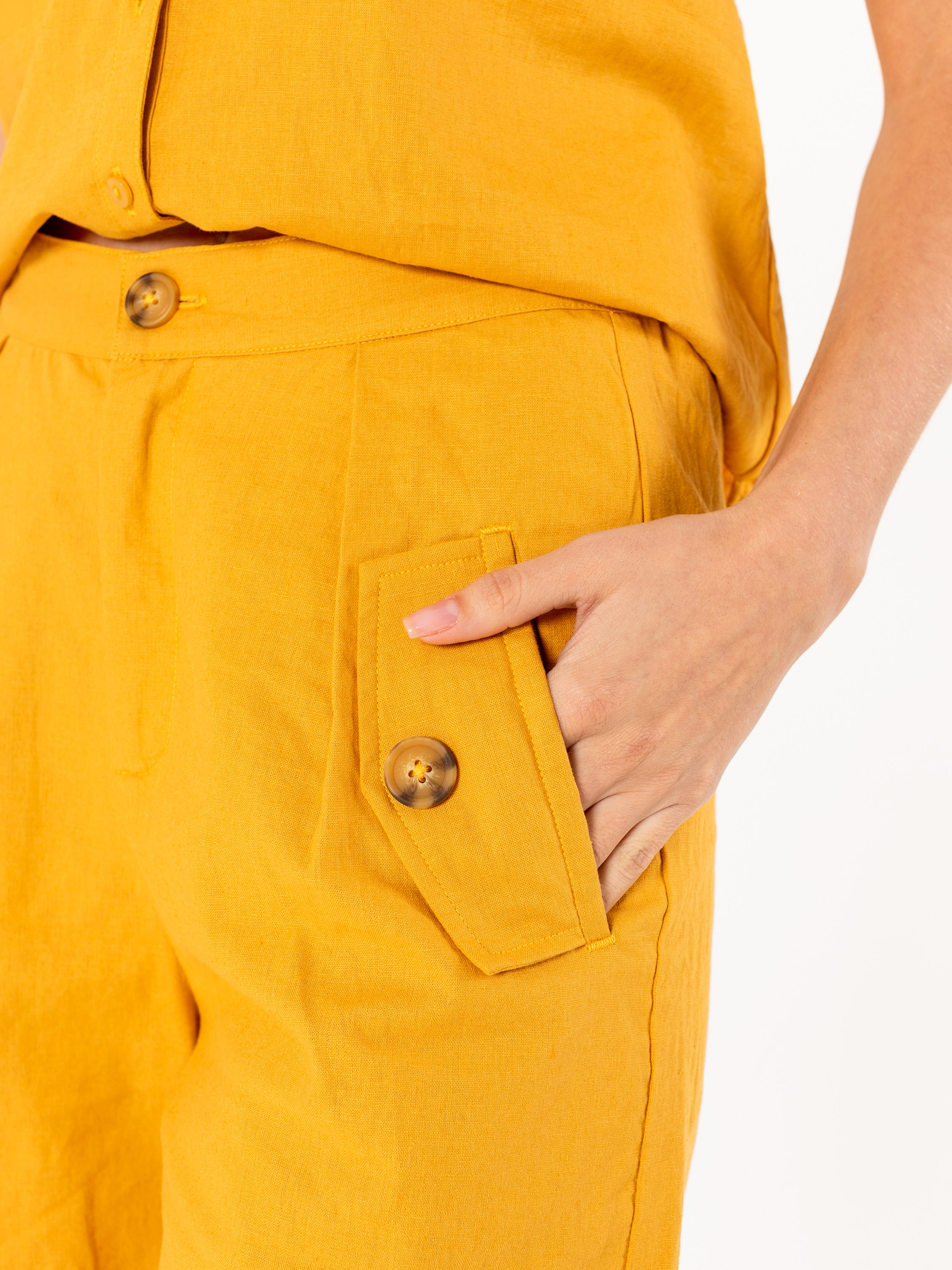 На сайте указаны российские размеры. Ткань: шорты выполнены из смеси льна и хлопка – натурального материала, который прекрасно пропускает воздух и не вызывает неприятных ощущений при носке. Крой: прямой силуэт со стандартной высотой пояса. Изысканные защипы моделируют фигуру, подчеркивают талию и гармонизируют область бедер. Функциональные карманы добавляют спортивного шика, делая образ современным и актуальным. Внизу расположены манжеты, которые при желании можно подвернуть, сделав шорты короче. Отделка: контрастные пуговицы на застежке и удобных карманах добавляют оригинальности модели. Застегиваются на молнию. В разделе блузок можно подобрать к шортам идеальную пару из идентичного материала, тем самым создав идеальный летний костюм.