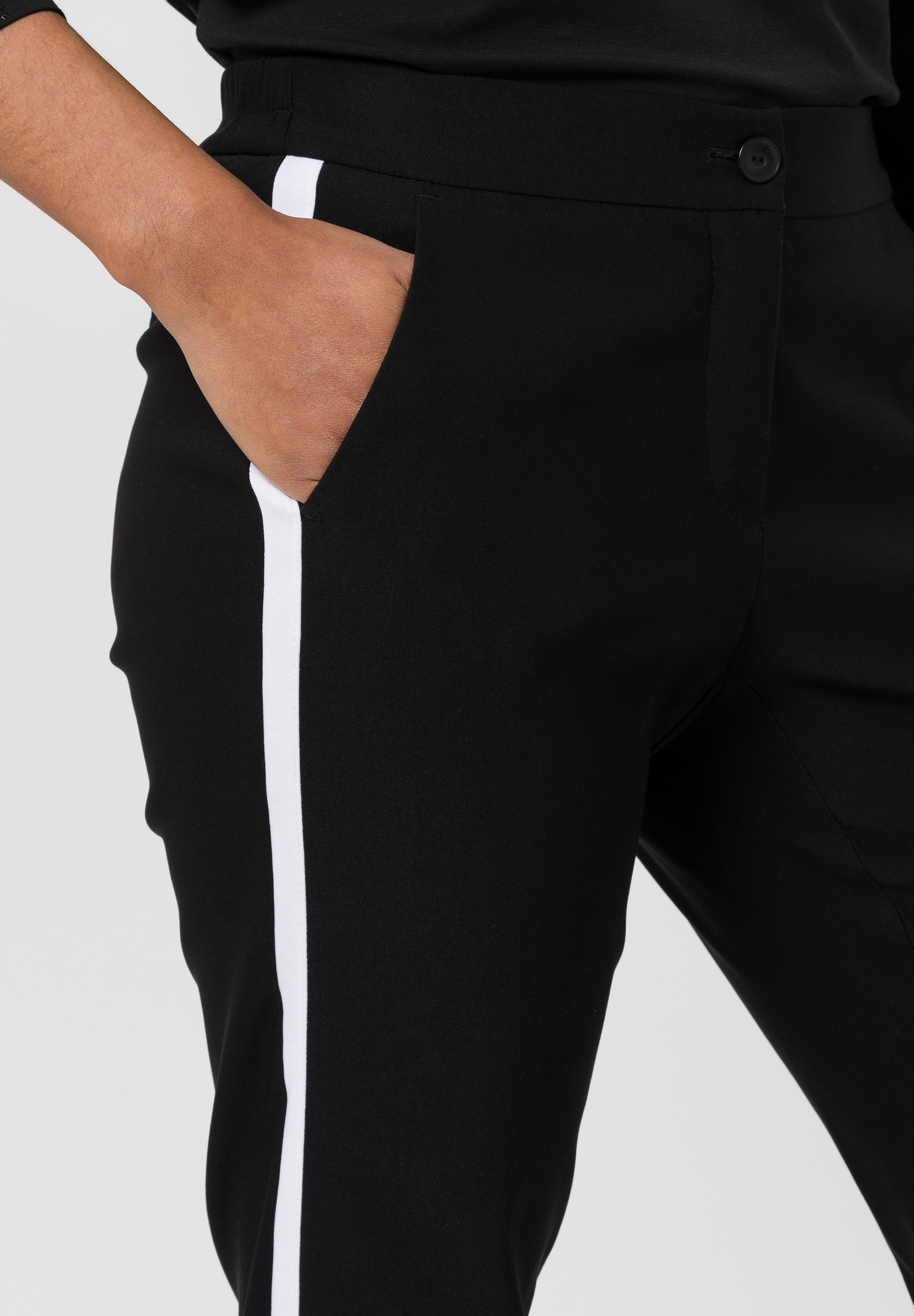 На сайте указаны российские размеры. Спортивные брюки с эластичным поясом с пуговицей, потайной молнией и боковыми карманами. Крой создает красивый силуэт. Контрастные полоски по бокам расставляют модные акценты.