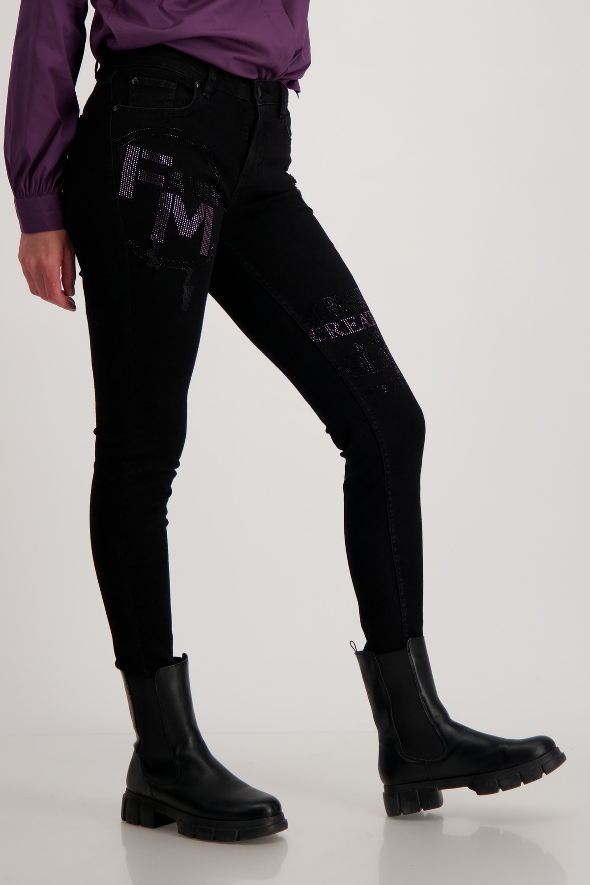 На сайте указаны российские размеры. Облегающие джинсы от monari. Модель со стандартной посадкой имеет классический 5-карманный фасон, пояс со шлевками для ремня и пуговицу на потайной застежке-молнии. Приятная степень эластичности также обеспечивает уникальный комфорт при ношении и делает узкие брюки с деталями из сверкающих стразов в верхней части спереди и сзади абсолютной изюминкой в вашем гардеробе. Надпись со стразами на заднем кармане из горного хрусталя и эмблема из горного хрусталя спереди. Рост модели 179 см.