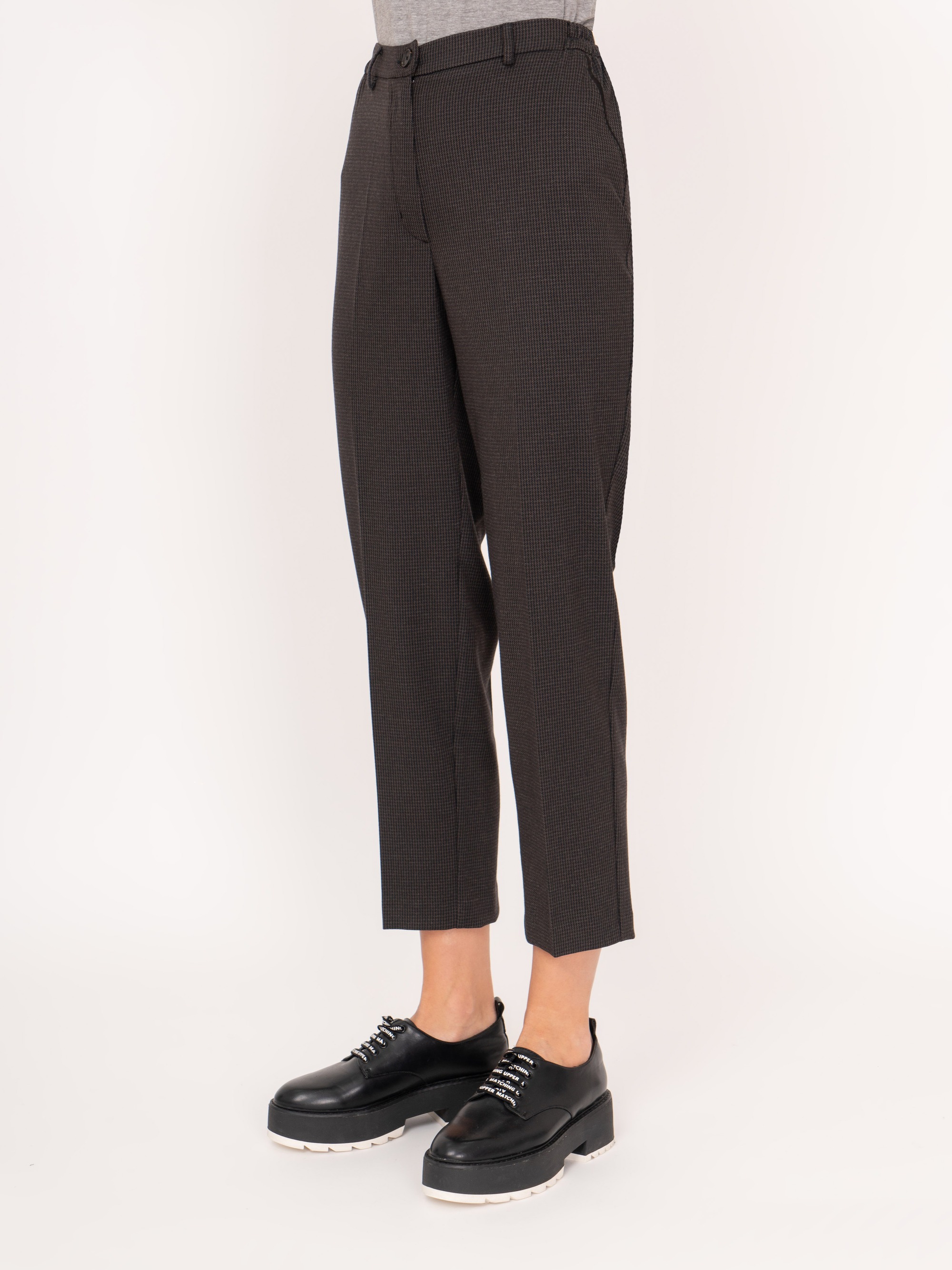 На сайте указаны российские размеры. Зауженные укороченные трикотажные коричневые брюки на молнии, с рисунком гусиная лапка. Идеальный офисный вариант. Рост модели: 175 см Длина брюк: 67 см.