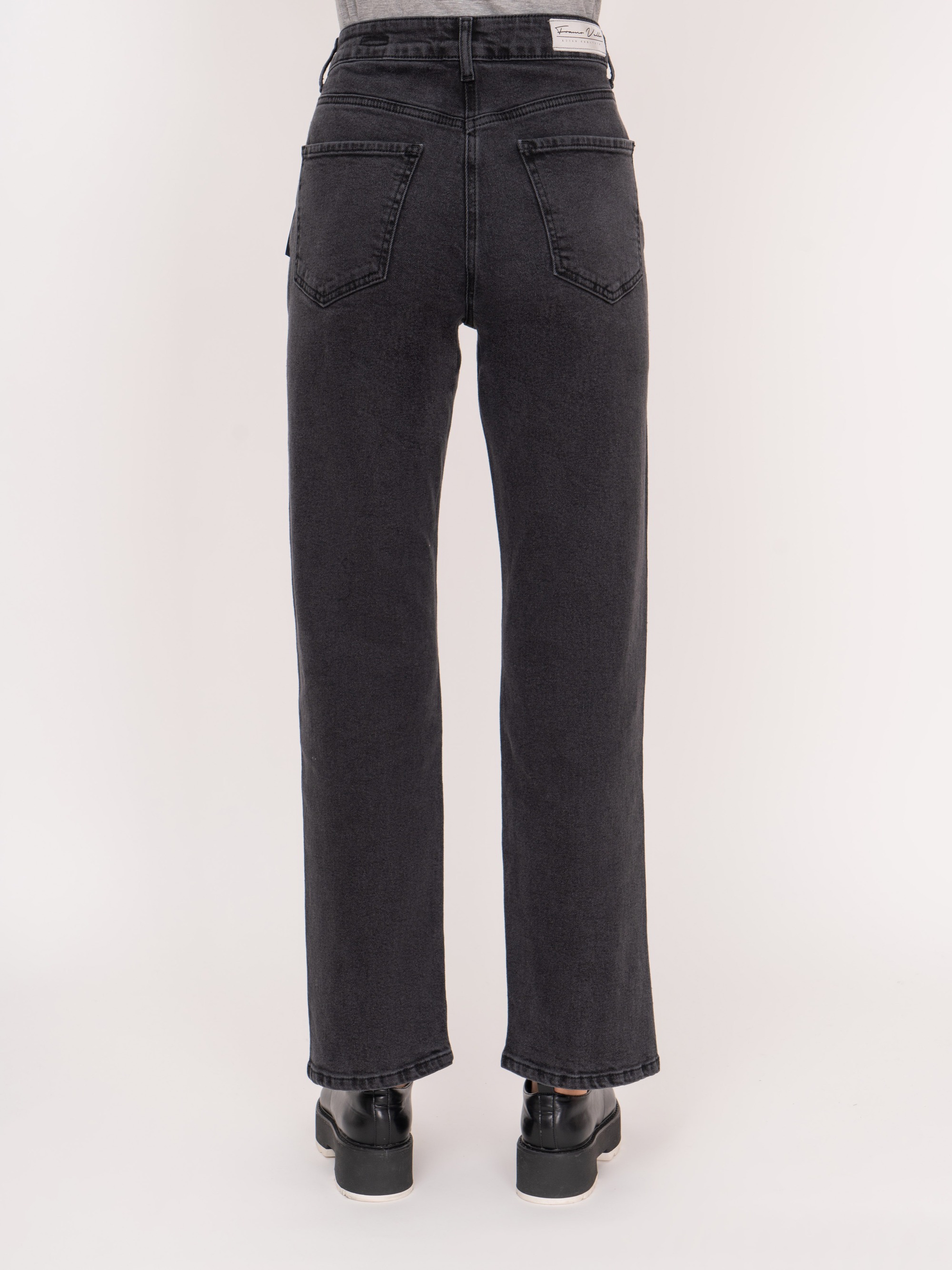 На сайте указаны российские размеры. Темно-серые джинсовые брюки клеш из плотного денима на молнии, с косыми и накладными карманами, с передними разрезами. Рост модели: 175 см Длина брюк: 77 см
