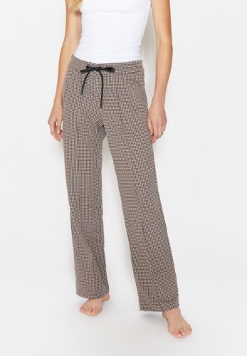 На сайте указаны российские размеры. Современные свободные брюки с модными декоративными швами. Легкая в уходе смесь материалов. Сплошной узор в клетку. Брюки удлиненные на шнурке.