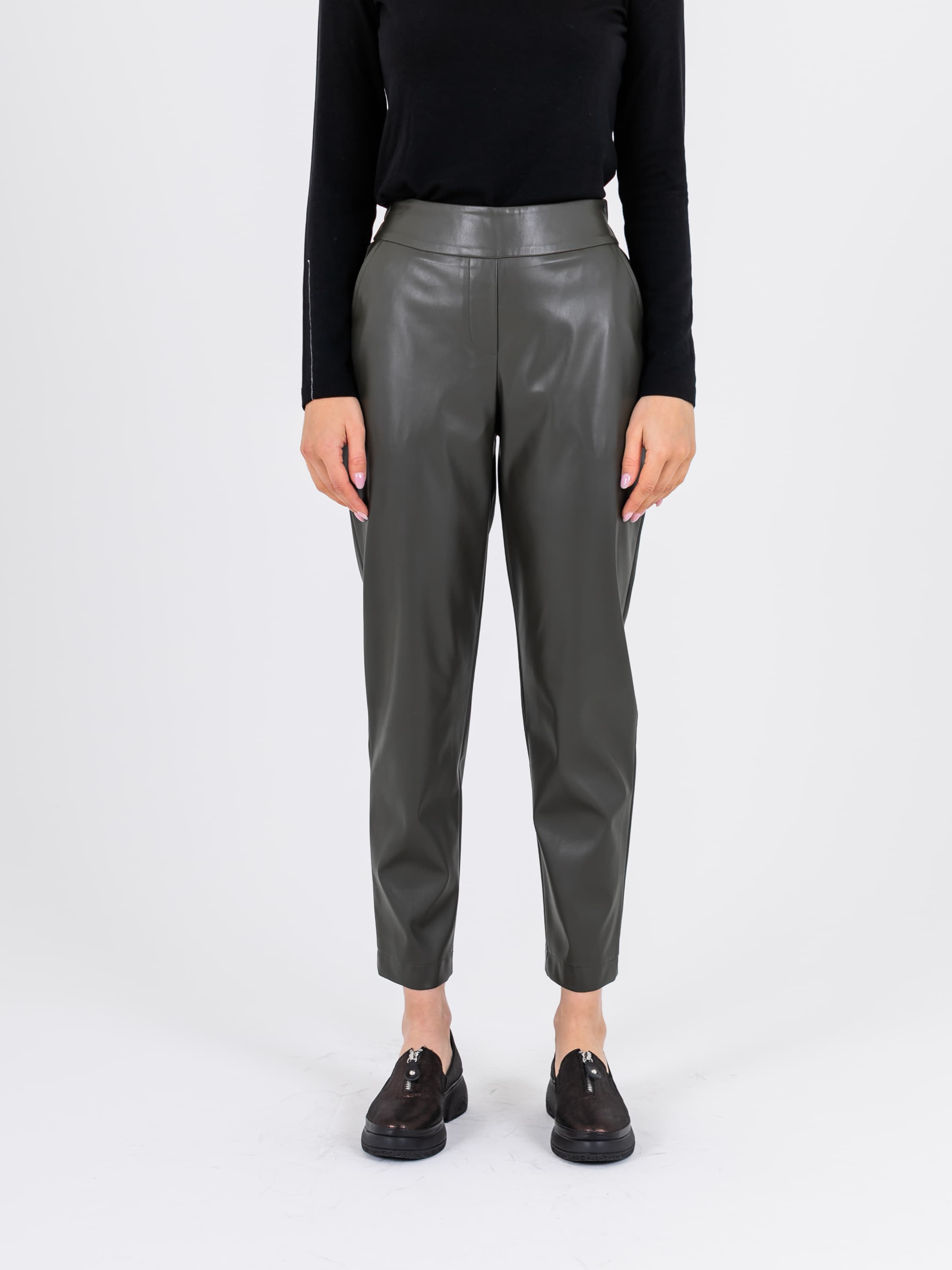 На сайте указаны российские размеры. Слегка укороченные брюки из экокожи в цвете хаки - просто писк моды. Брюки на резинке сзади. Модель имеет 4 кармана: 2 спереди и 2 сзади. Ткань: 55% полиуретан, 40% поливискоза, 5% эластан. Практичный материал, загрязнения с которого легко удаляются влажной салфеткой, что особенно актуально в межсезонье. Крой: ультрастильные кожаные брюки длины 7/8. Имеют средне-высокую посадку, которая подчеркивает красоту талии и скрывает недостатки в области живота. Прямой силуэт подходит под разные типы фигуры, уравновешивает область бедер и позволяет добиться максимального комфорта при движении. Брюки имеют два функциональных кармана спереди и два прорезных сзади. Отделка: особенностью модели является оригинальная зона пояса: гладкая спереди и собранная резинкой – сзади. Этот элемент обеспечивает дополнительный комфорт при надевании. Рост модели: 173 см