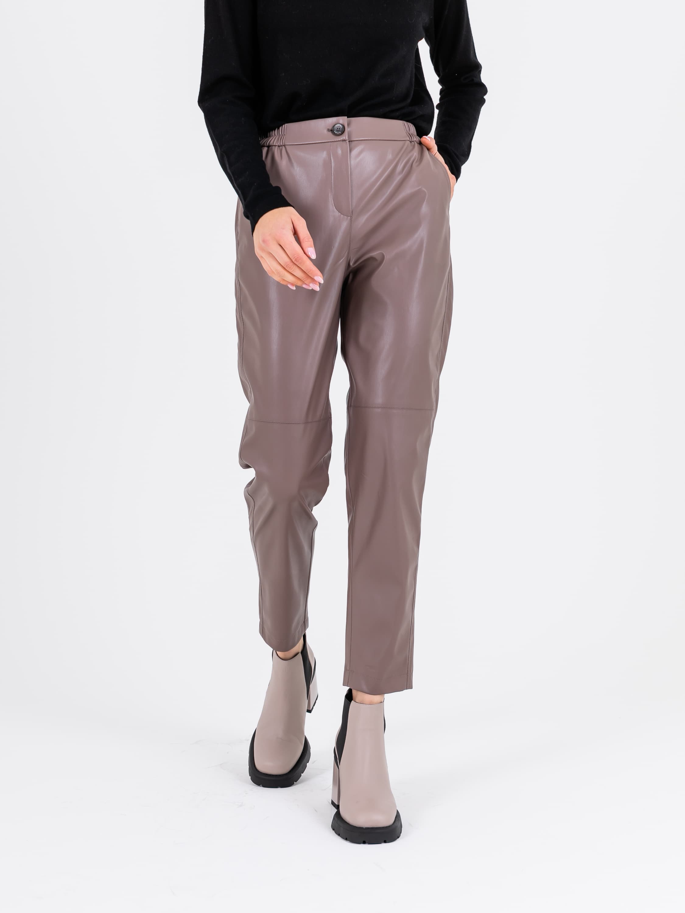 На сайте указаны российские размеры. Брюки из экокожи слегка укороченные в бежевом цвете. Впереди застежка на молнию и пуговицу, сзади эластичная резинка. Модель имеет 2 кармана спереди. Ткань: искусственная кожа высокого качества (55% полиуретан, 40% поливискоза, 5% эластан). Практичный материал, загрязнения с которого легко удаляются влажной салфеткой, что особенно актуально в межсезонье. Крой: прямой свободный силуэт создает идеальную вертикаль, которая визуально вытягивает и стройнит фигуру, корректируя область бедер. Имеют актуальную высокую посадку. Удобные карманы по бокам вместят все самое важное, что может пригодиться в ближайшее время. Застегиваются на пуговицу и молнию. Стильный оттенок тауп подчеркнет прекрасный вкус и чувство стиля. Отделка: верхняя и нижняя часть брюк разделяются неконтрастной строчкой, которая добавляет оригинальности, но не перегружает образ. Рост модели 175 см.
