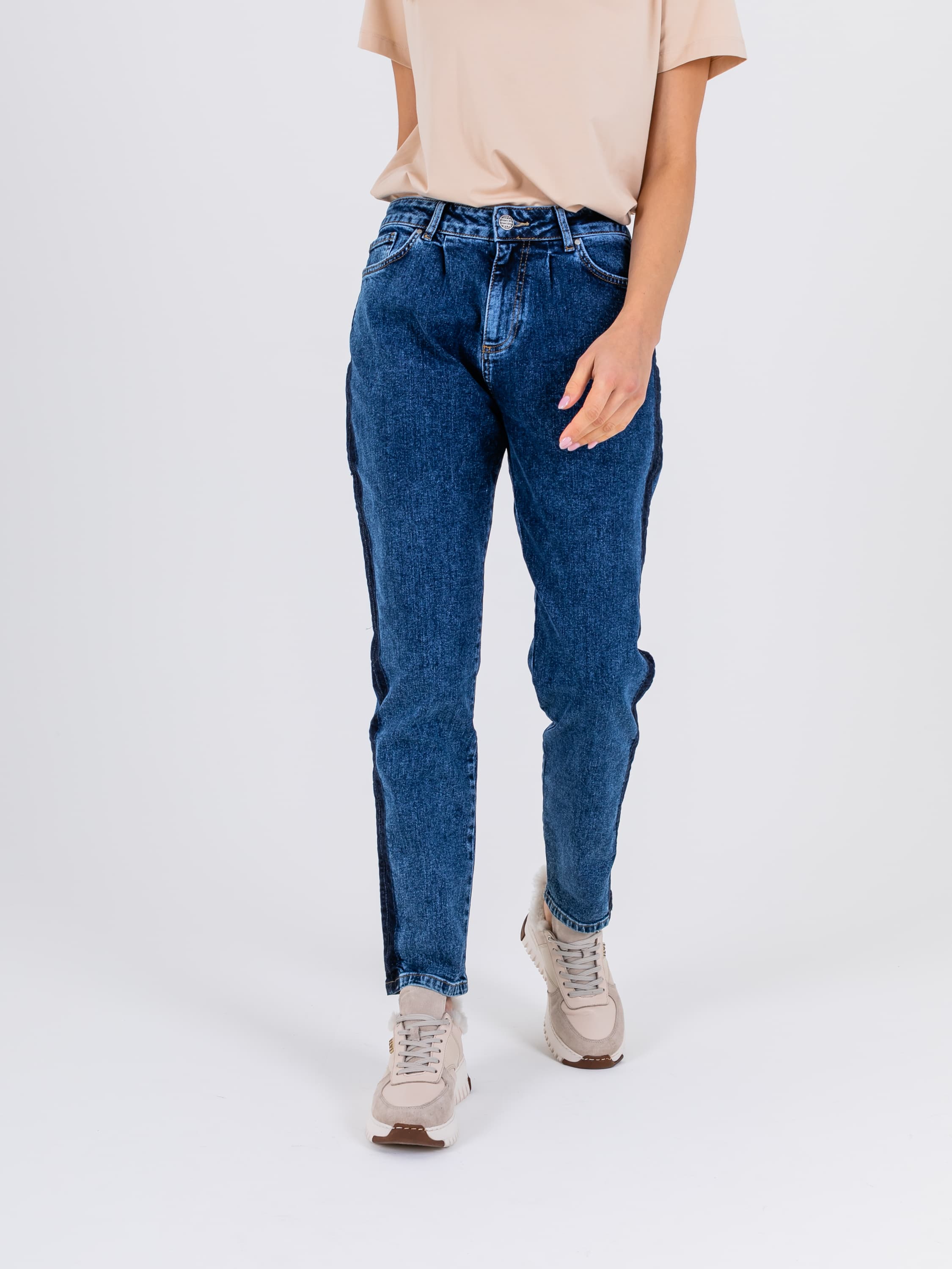 На сайте указаны российские размеры. Классические джинсы MOM c интересной затемненной полоской по внешнему бокововому шву модели. Рост модели 175 см.