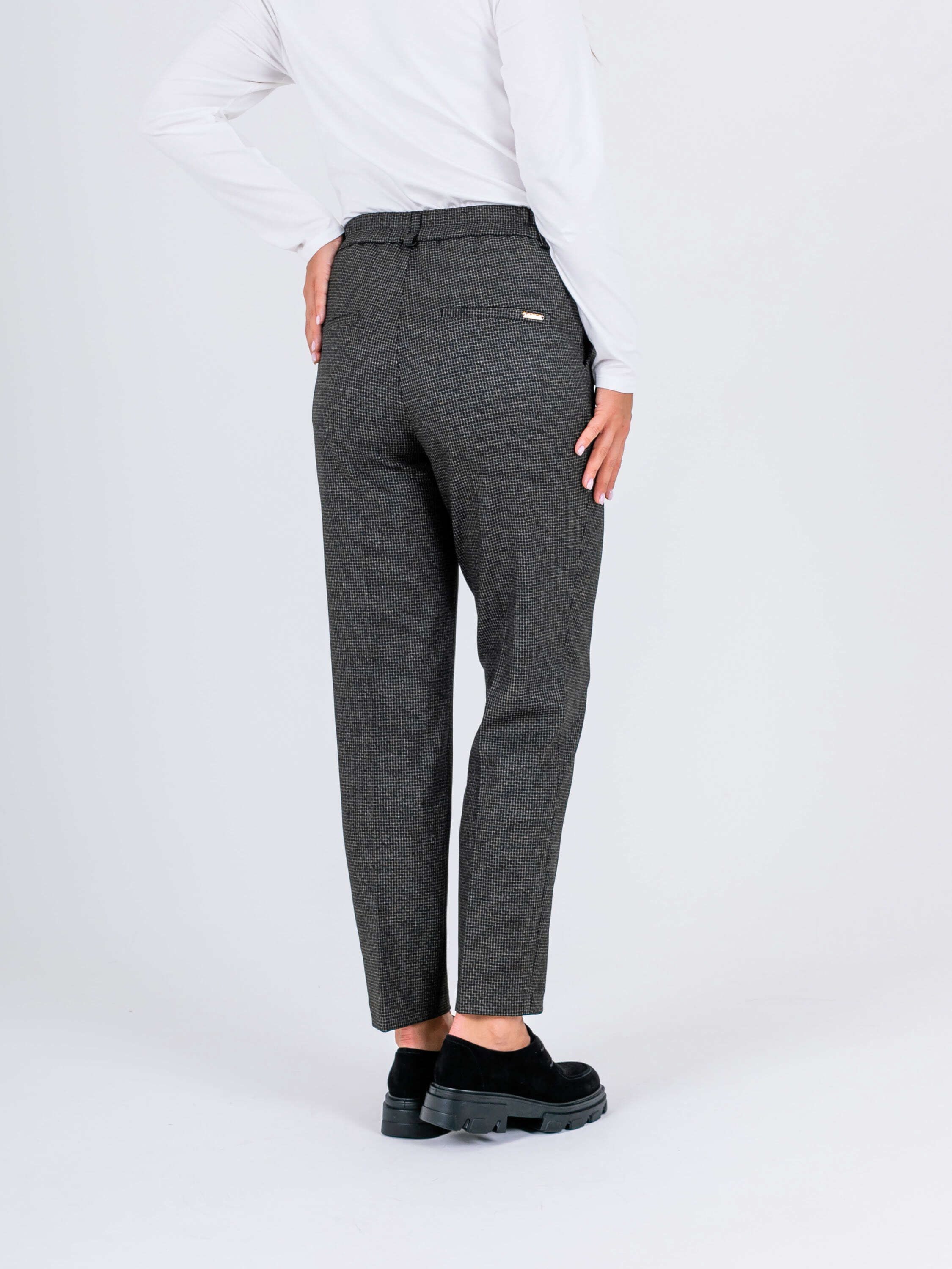 На сайте указаны российские размеры. Ткань: смесовая ткань в мелкую клетку средней плотности (63% полиэстер, 32% вискоза, 5% эластан) Крой: современная классика – брюки прямого кроя с высокой посадкой, идеально сидящие по фигуре. Имеют два удобных кармана спереди и два прорезных кармана сзади, а также строгие стрелки, которые добавляют образу законченности и стиля. Застегиваются на молнию и пуговицы. Отделка: задний карман украшен фирменным шильдиком Stern. В модели предусмотрены шлевки, в которые можно вдеть тонкий пояс или платок
