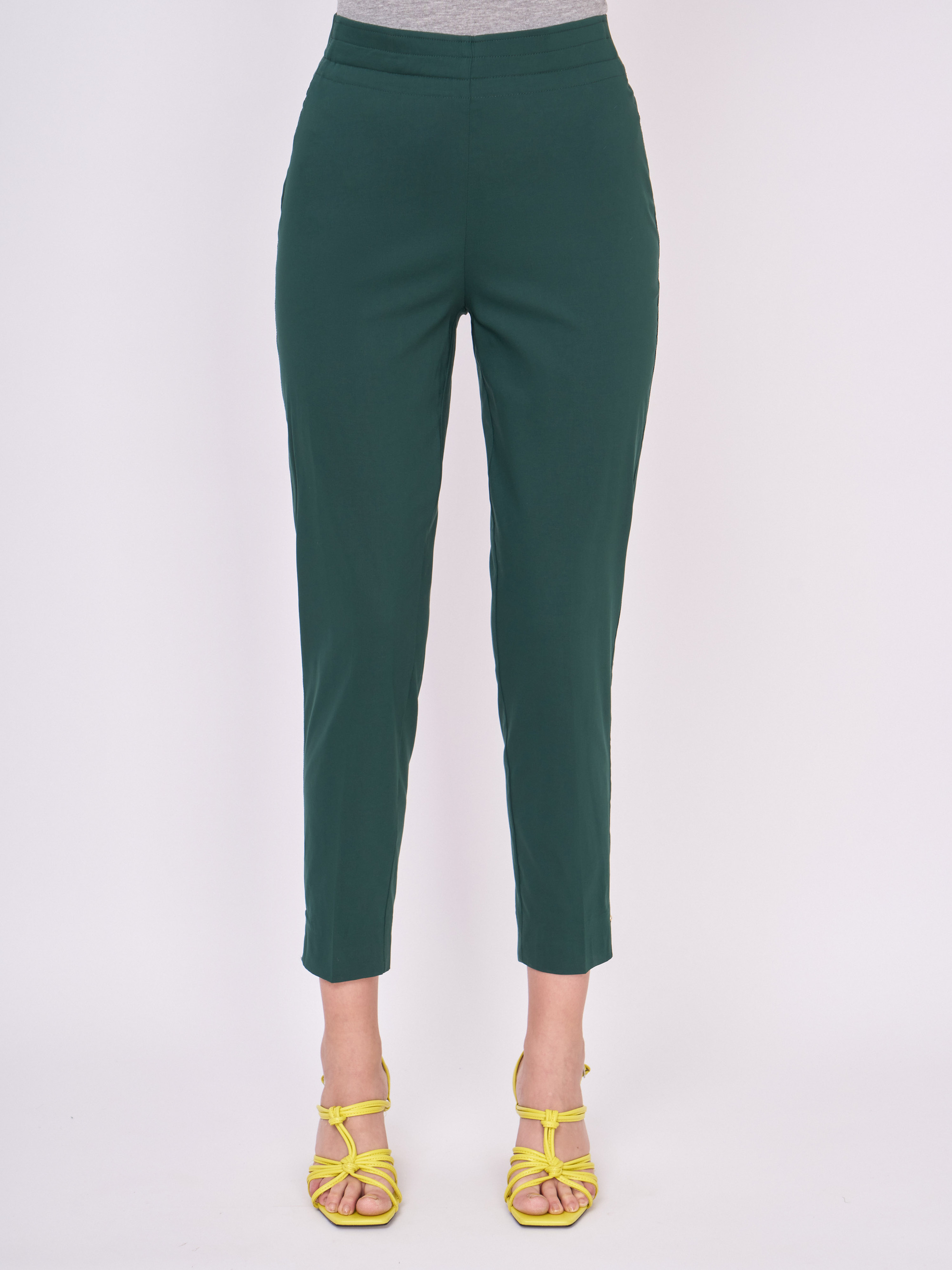 На сайте указаны российские размеры. Хлопковые зауженные темно-зеленые брюки на резинке, без карманов. Длина брюк: 71 см. Рост модели: 177 см.