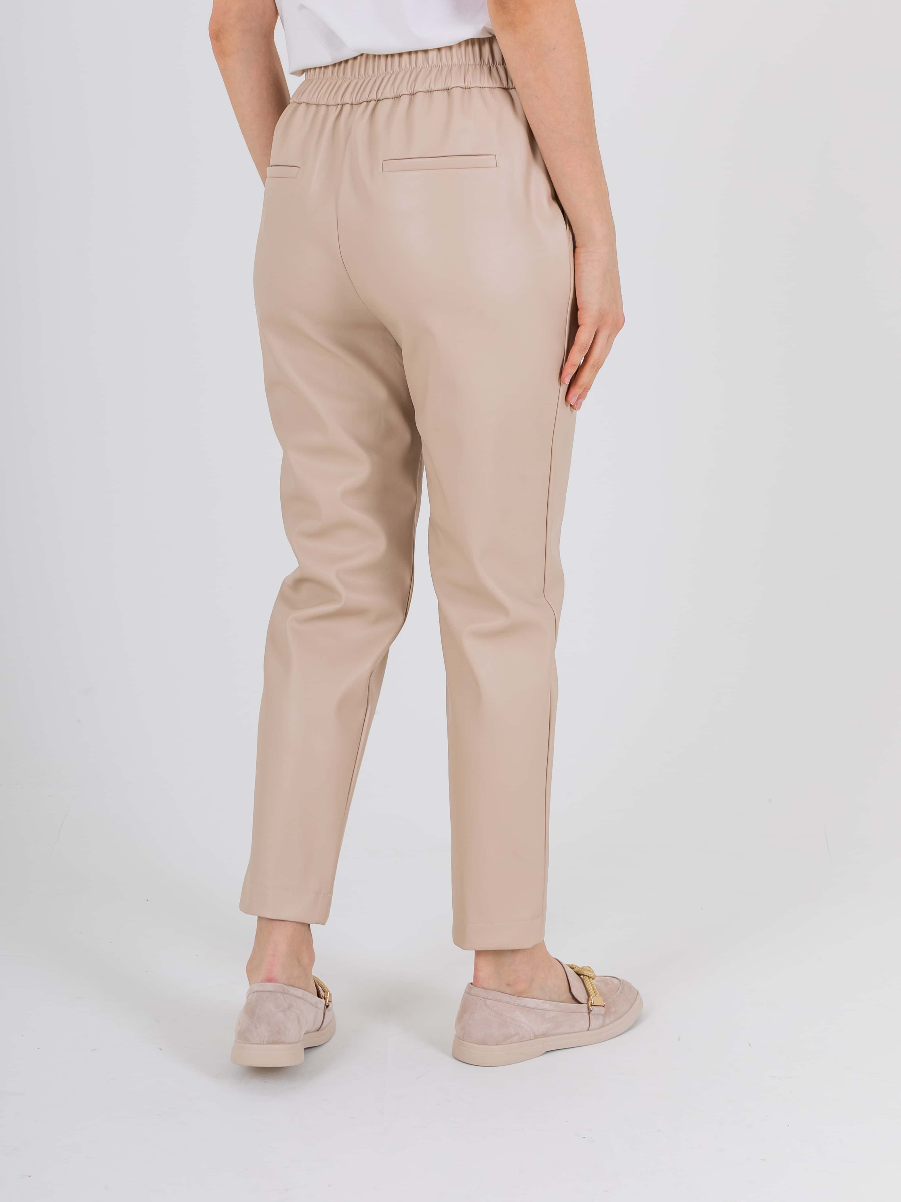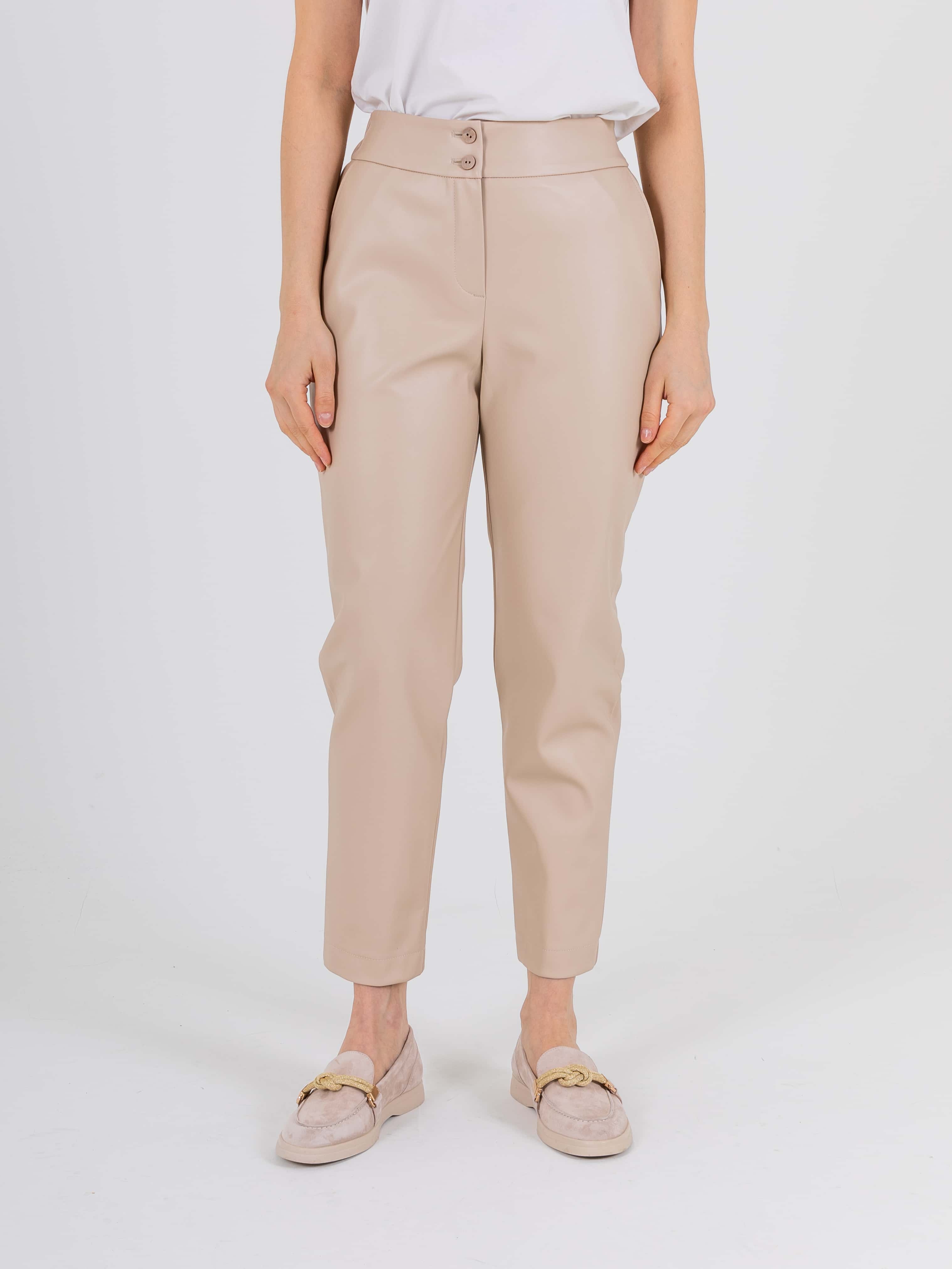 Брюки с завышенной талией длиной до щиколотки с застежкой на молнию и 2 пуговицы. Брюки слегка зауженные книзу. На передних половинках расположены два кармана с отрезным бочком. На задних половинках два прорезных кармана с листочками. Верх брюк обработан поясом на резинке.
