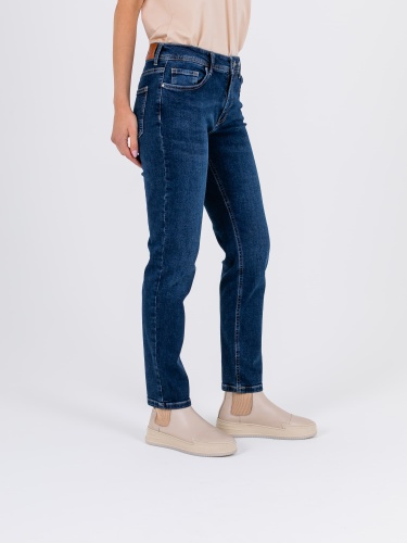 Длинные джинсы «Slim Fit» с застежкой на молнию и 1 пуговицу. Джинсы слегка зауженные книзу, с легким варёным эффектом. На передних половинках расположены два кармана с отрезным бочком и один монетный карман. На задних половинках два накладных кармана и фигурная кокетка. Верх брюк обработан поясом со шлевками.