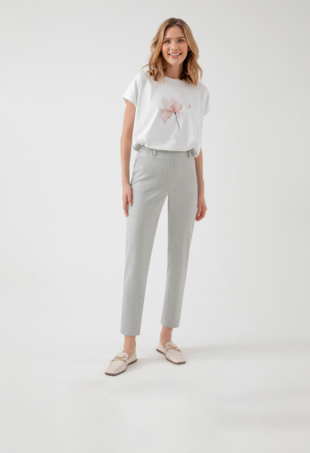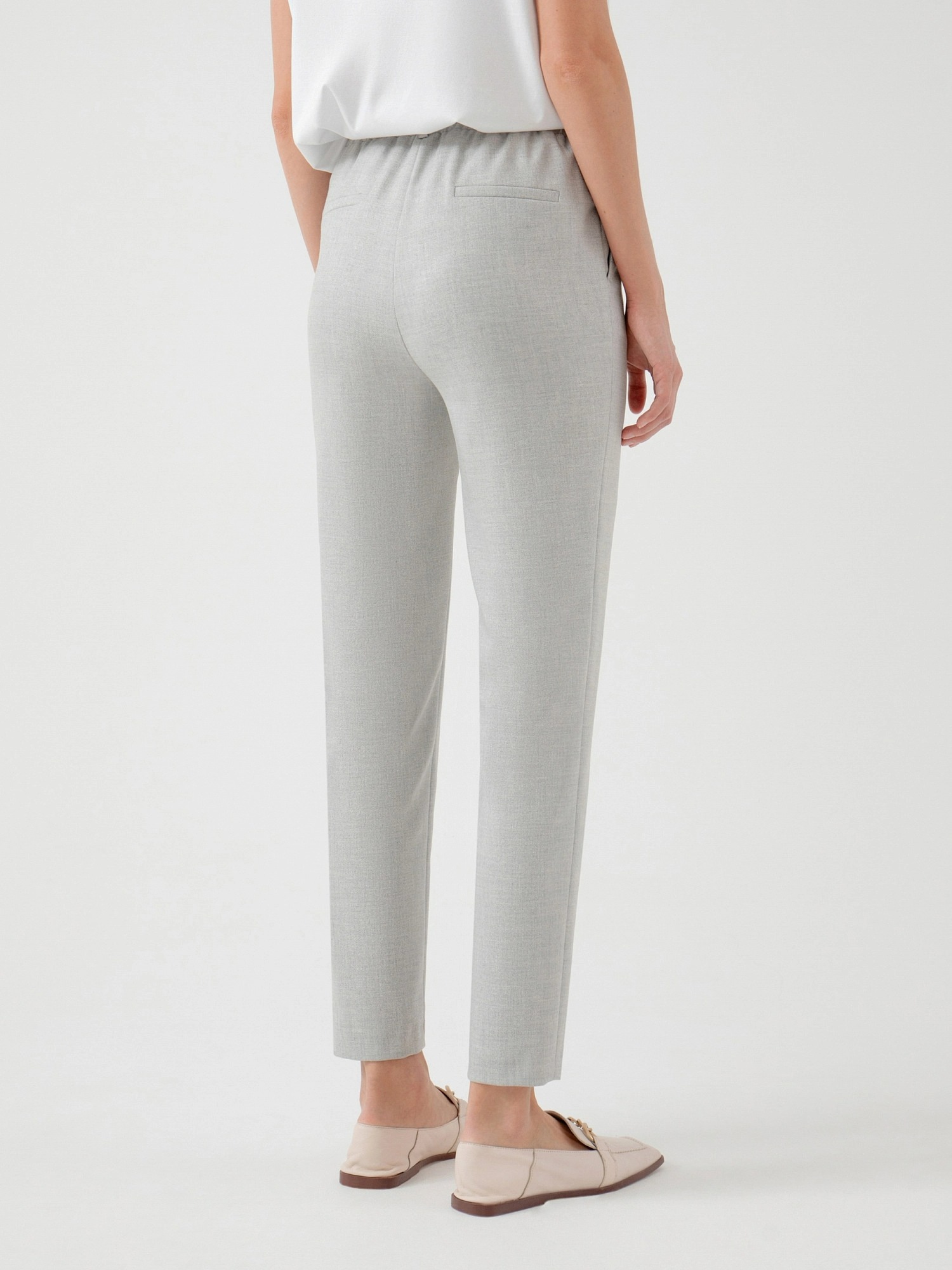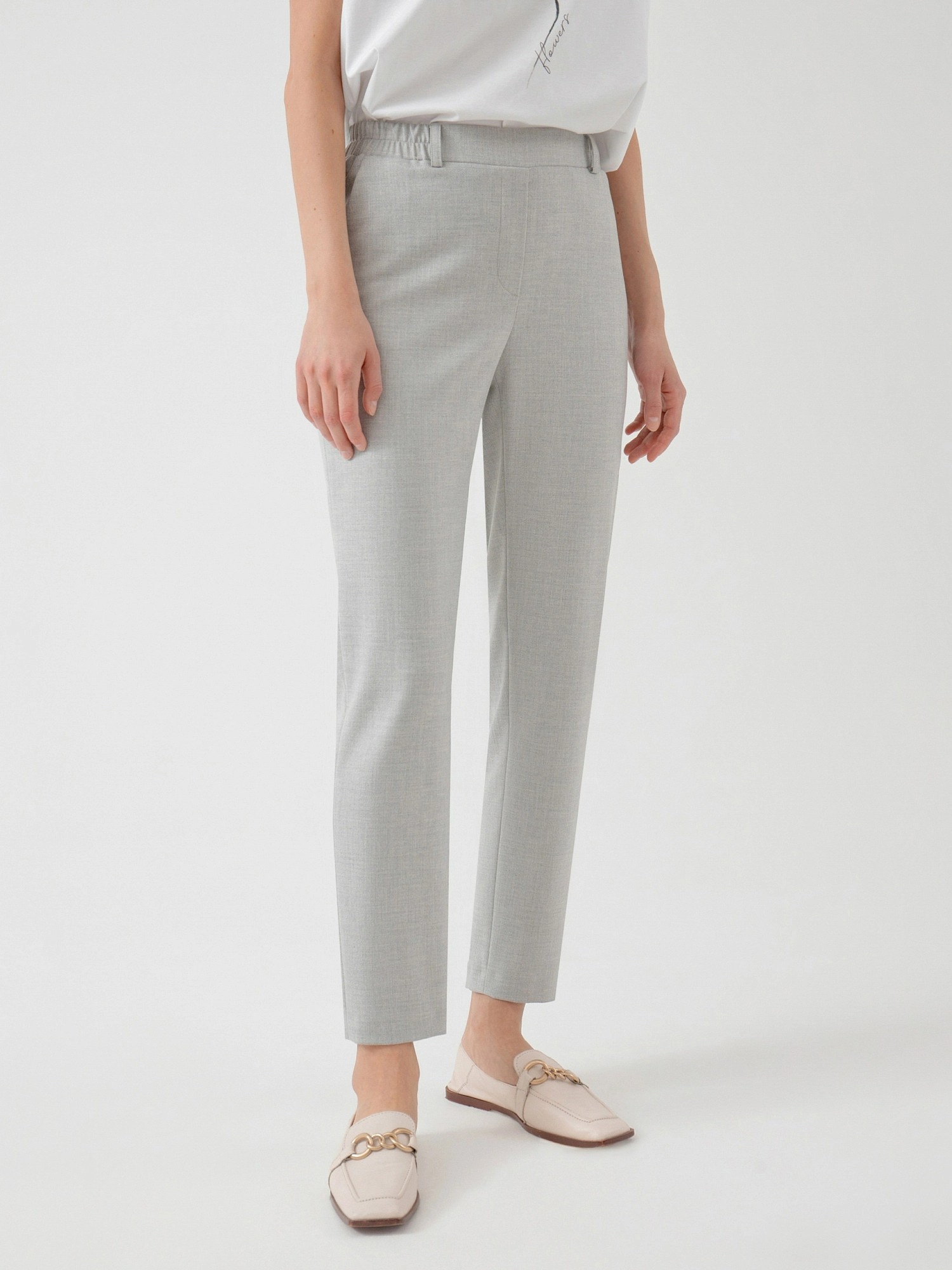 На сайте указаны российские размеры. Брюки из костюмной ткани зауженного к низу силуэта на притачном поясе со шлевками и рабочими карманами по бокам. Застежка спереди на молнию и крючок. Модель идеально подойдёт для создания классических образов с мягкими трикотажными джемперами. Рост модели 175 см.