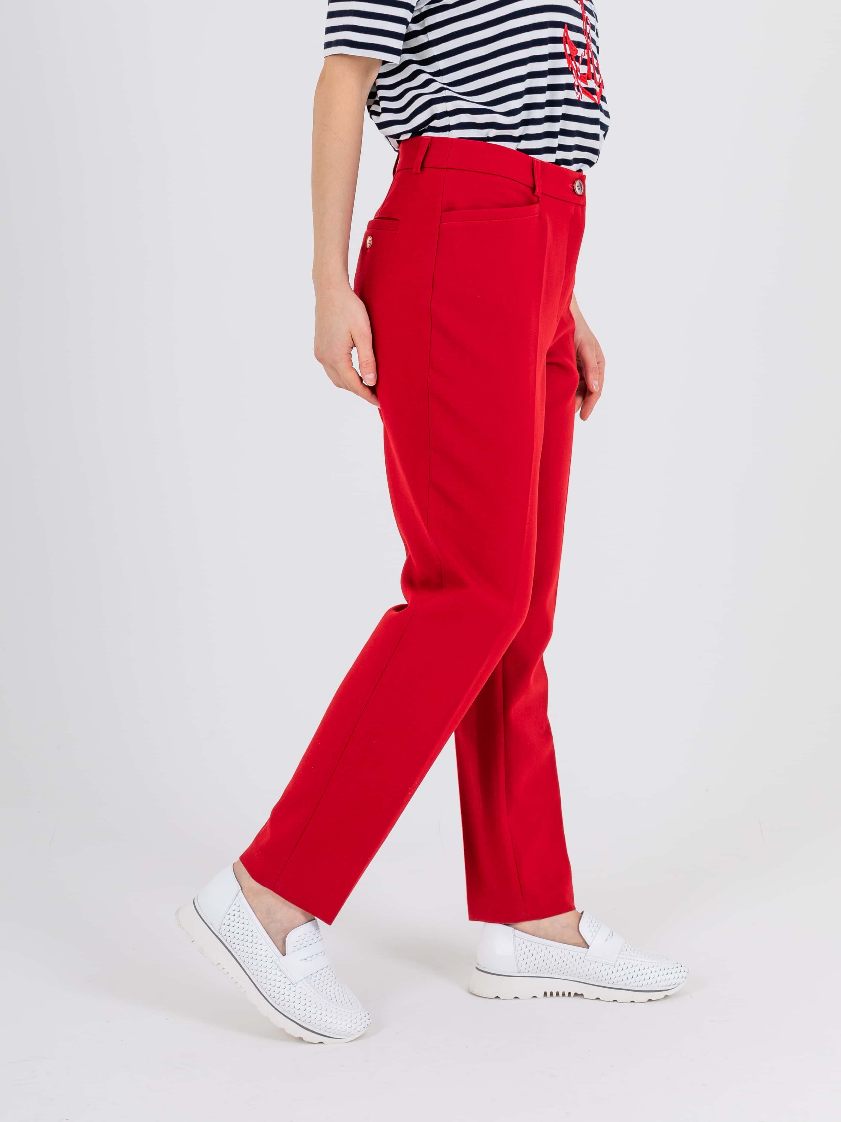 На сайте указаны российские размеры. Прямые брюки с завышенной талией длиной до щиколотки с застежкой на молнию и 1 пуговицу. Брюки слегка зауженные книзу. На передних половинках расположены два кармана с отрезным бочком и листочкой. На правой задней половинке прорезной карман с листочкой, прорезной петлей и пуговицей, для фиксации кармана. Верх брюк обработан поясом со шлевками.