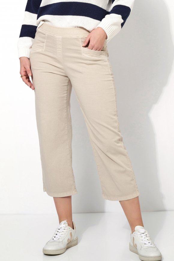 На сайте указаны российские размеры. Летние брюки из легкого смесового хлопка, с эластичным поясом, расклешенными штанинами и воздушной длиной 3/4. Длина по внутреннему шву: 60 см. Рост модели 178 см.