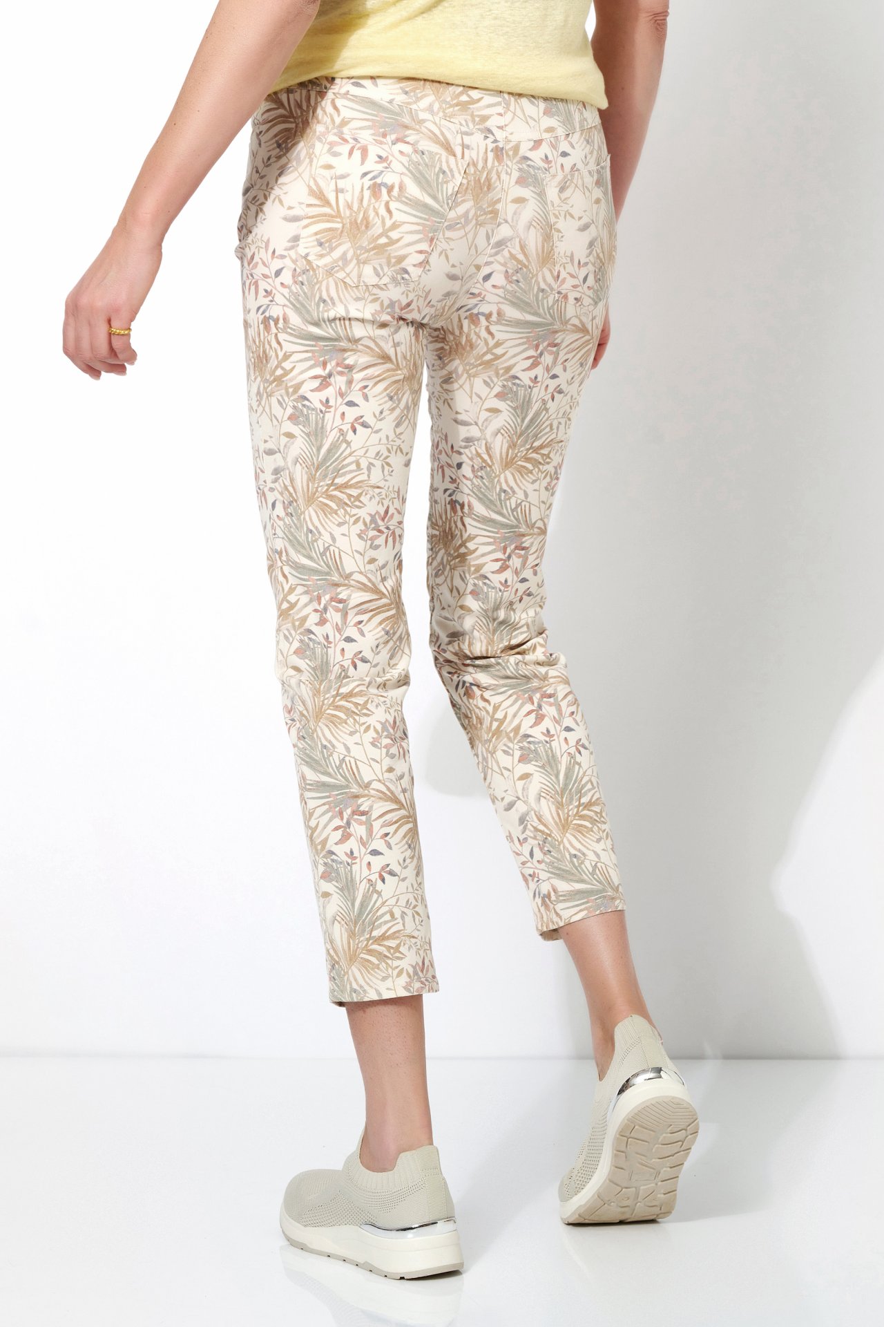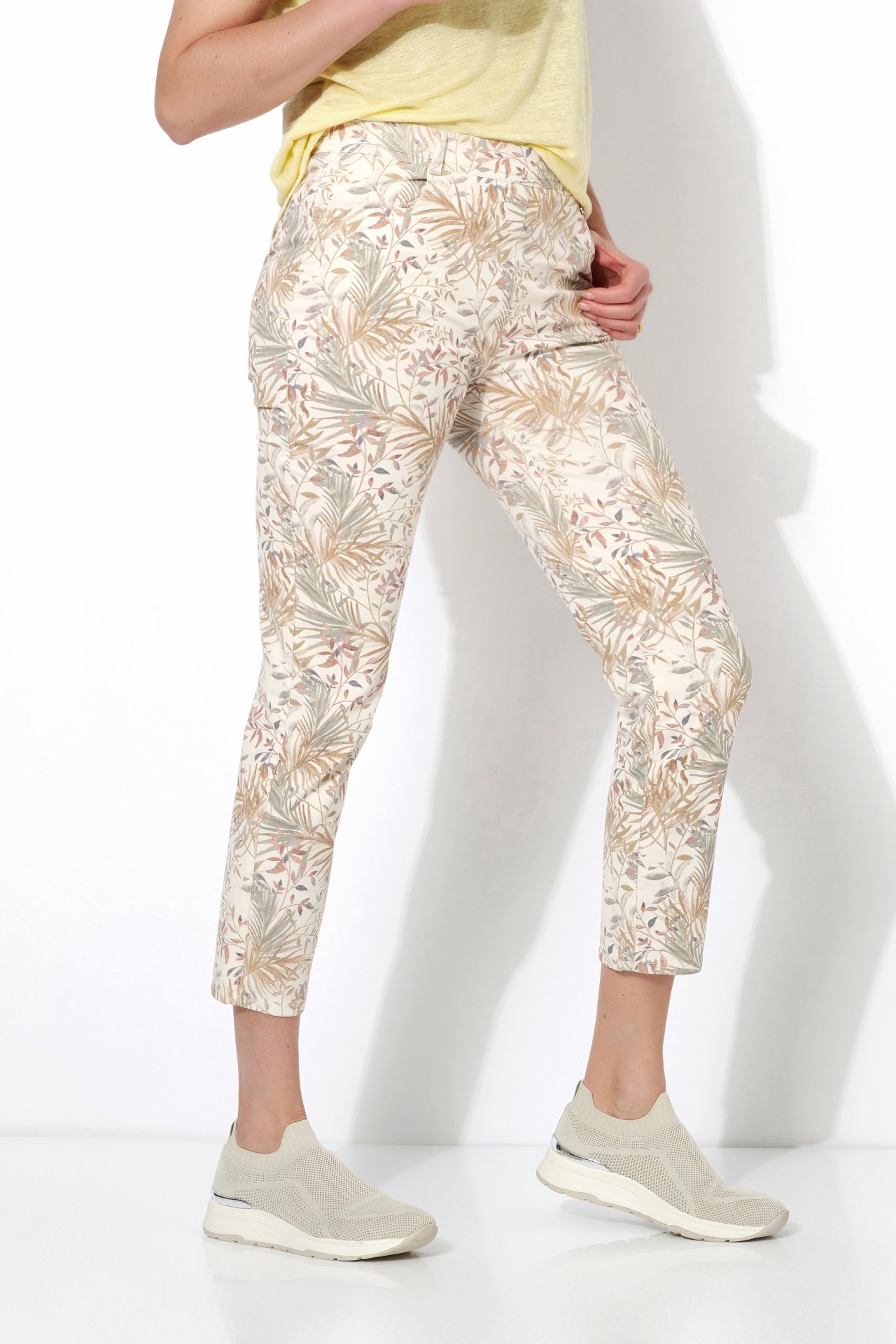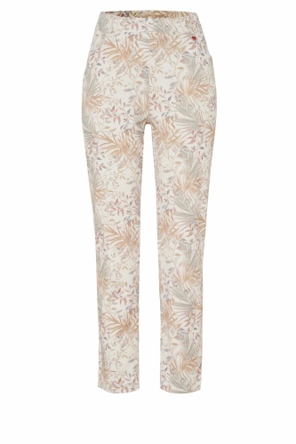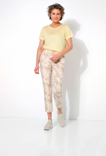 На сайте указаны российские размеры Брюки длиной 7/8 с креативным натуральным принтом, удобным поясом на кулиске, высокой талией, выполнены из модного хлопка. Длина по внутреннему шву: 72 см. Рост модели 180см.