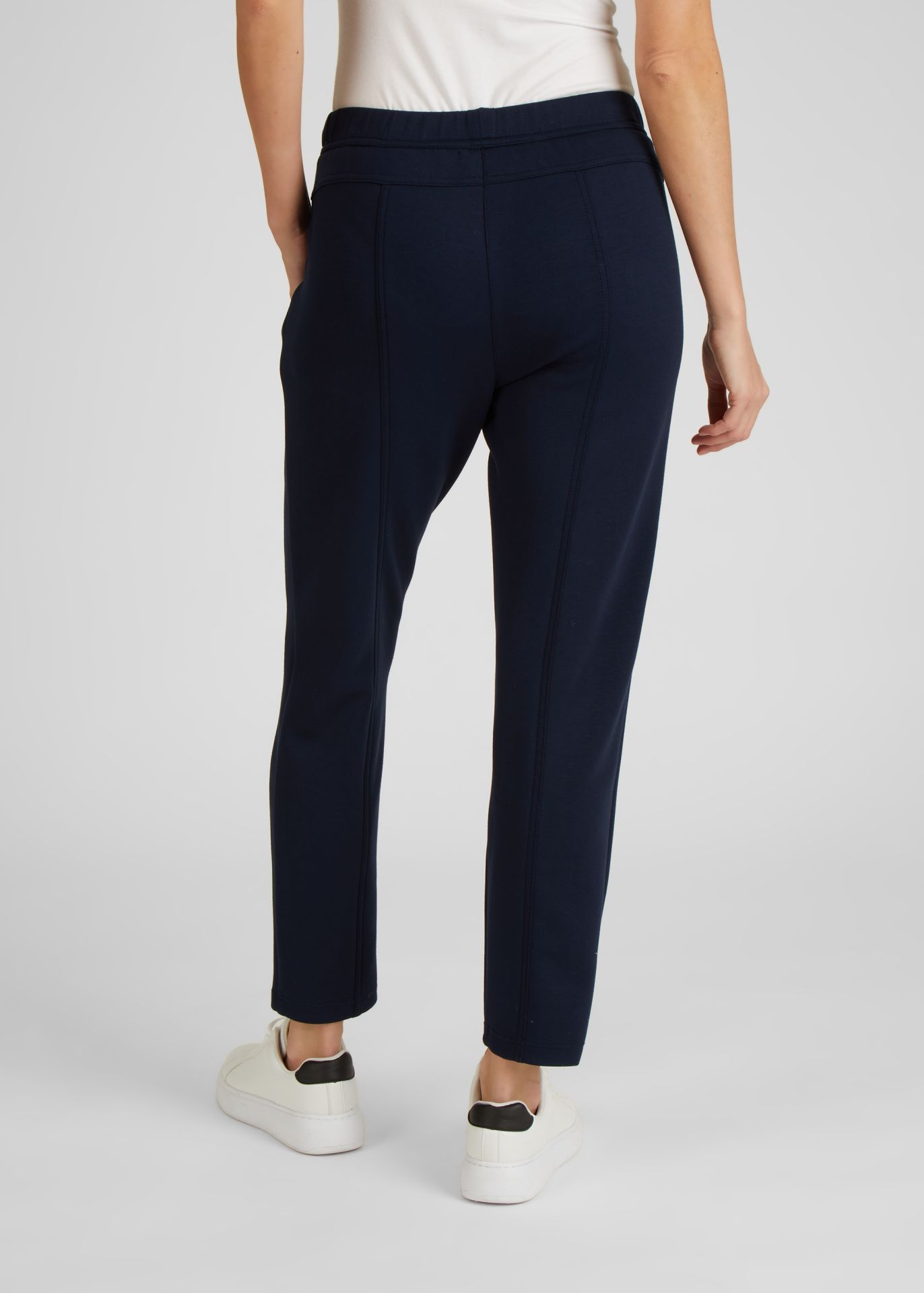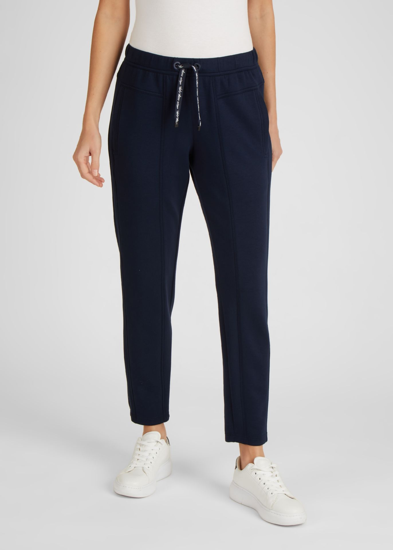 На сайте указаны российские размеры. Современные брюки узкого кроя не только впечатляют своим высоким комфортом при ношении. Брюки выполнены из мягкого смесового трикотажа и регулируются кулиской на поясе. Боковые карманы и декоративные швы придают брюкам непринужденный вид. Однотонную модель также можно хорошо сочетать с рубашками в стиле кэжуал. Длина штанины по внутренней стороне для размера 46: 72 см. Рост модели 176 см.