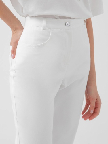 На сайте указаны российские размеры. Брюки прямого силуэта на притачном поясе со шлевками и фигурными рабочими карманами. Застежка спереди на молнию и пуговица. Сзади фигурная кокетка и крупные накладные карманы. Рост модели 175 см.