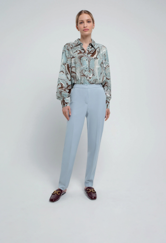 На сайте указаны российские размеры. Брюки со стрелками из костюмной ткани зауженного к низу силуэта на притачном поясе со шлевками. Спереди боковые карманы и застежка на молнию и крючок. Рост модели 175 см.