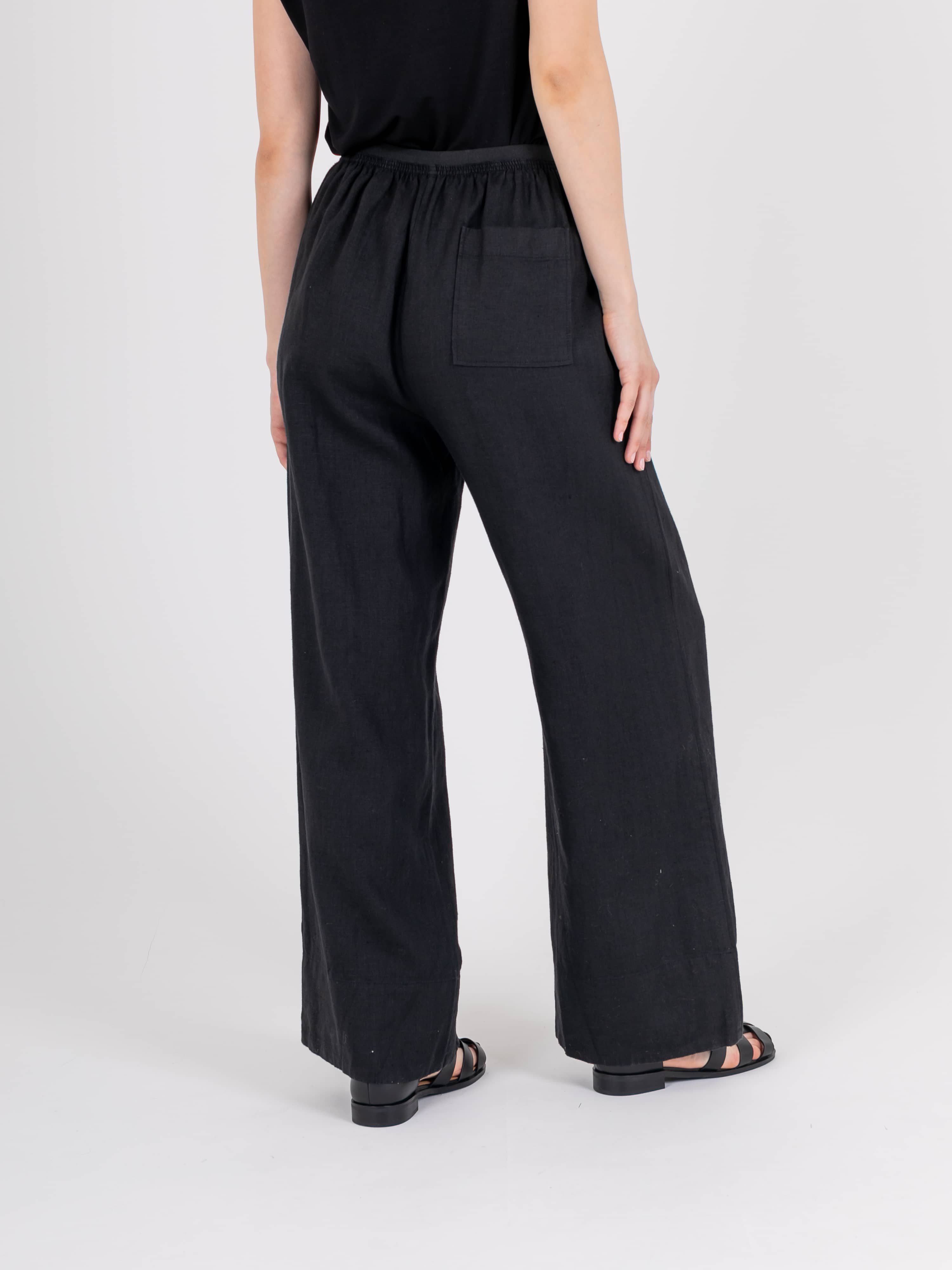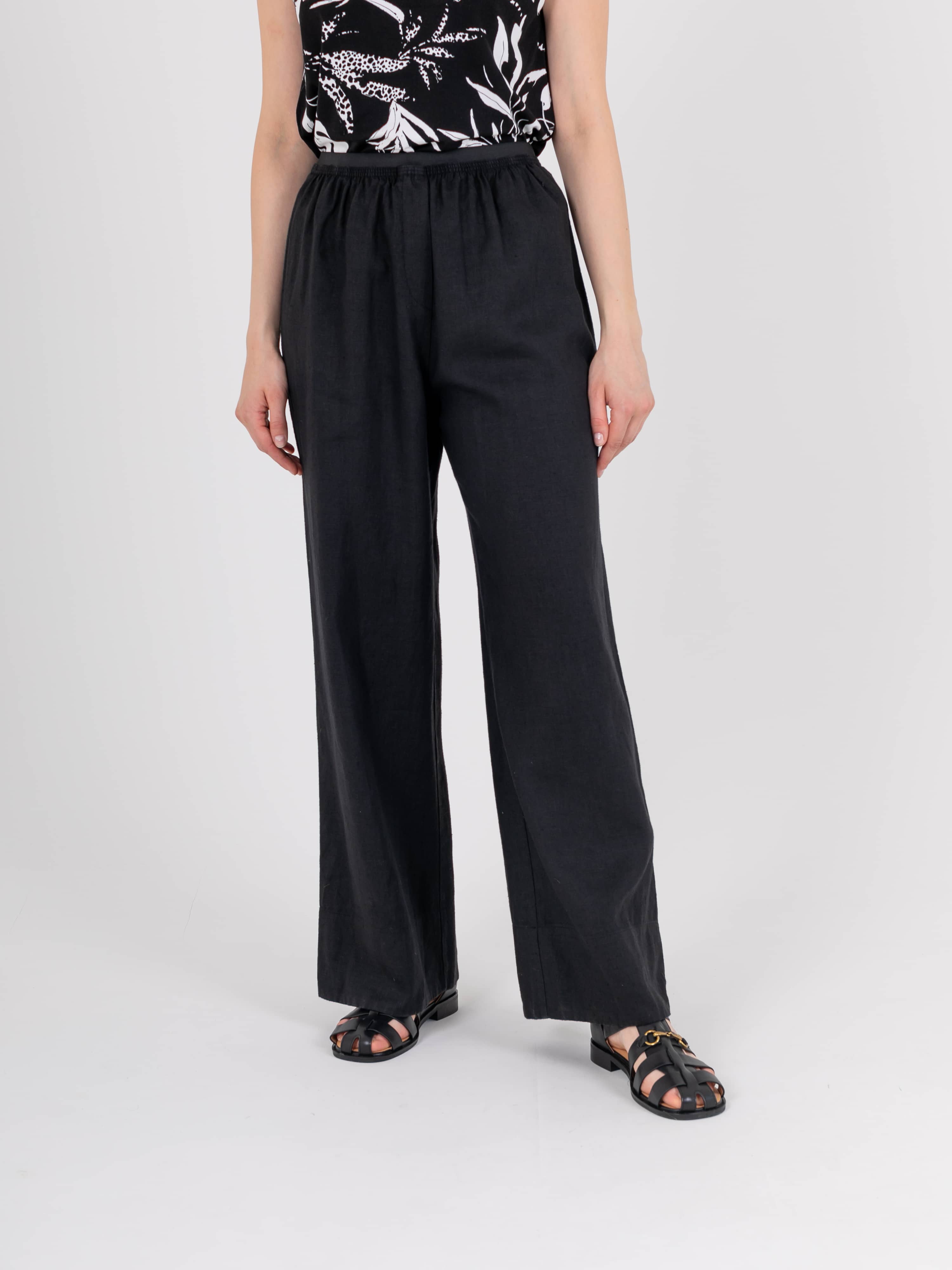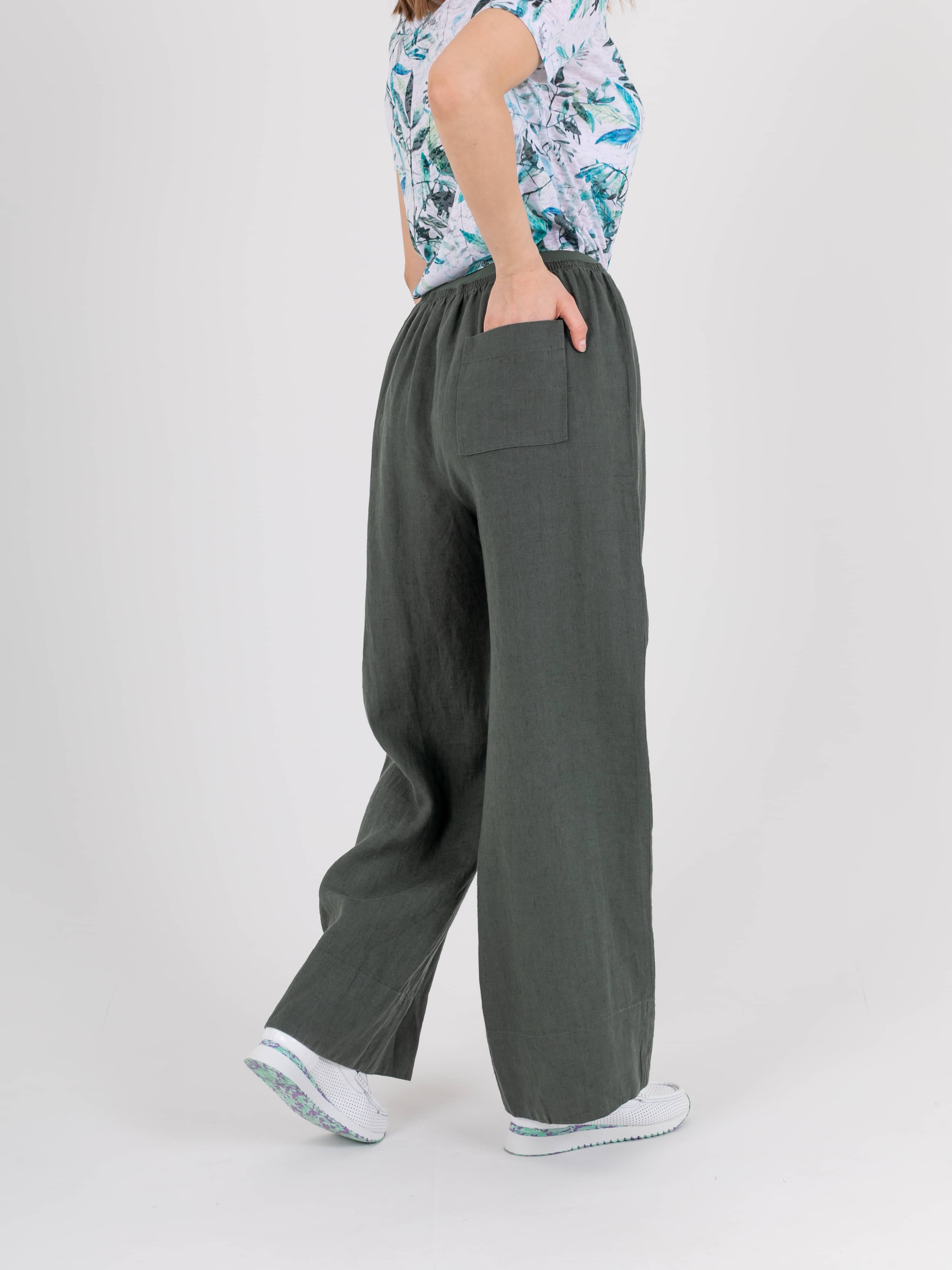 Прямые удлиненные брюки «трубы» из натурального льна. На правой задней половинке брюк расположен накладной карман. Верх брюк на резинке.