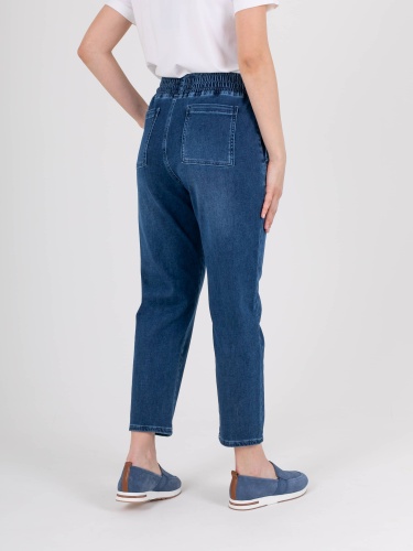 Джинсы «Basic» с завышенной талией длиной до щиколотки с имитацией гульфика без застежки. Джинсы слегка зауженные книзу, с легким варёным эффектом. На передних половинках расположены два кармана с отрезным бочком. На задних половинках два накладных кармана. Верх брюк обработан поясом на резинке со шнуром и металлическими наконечниками.