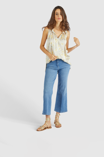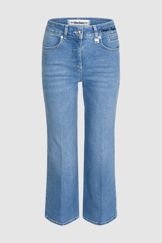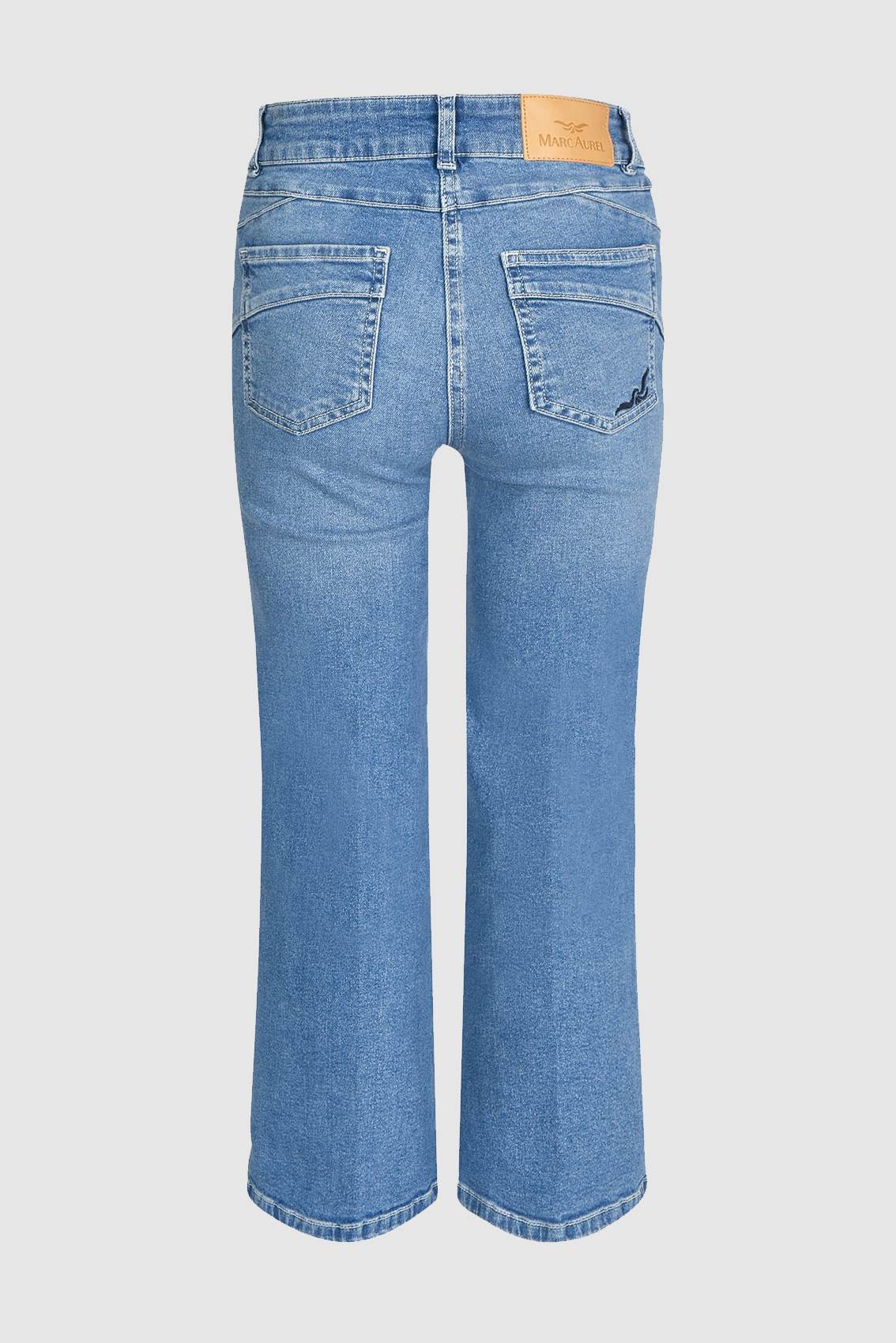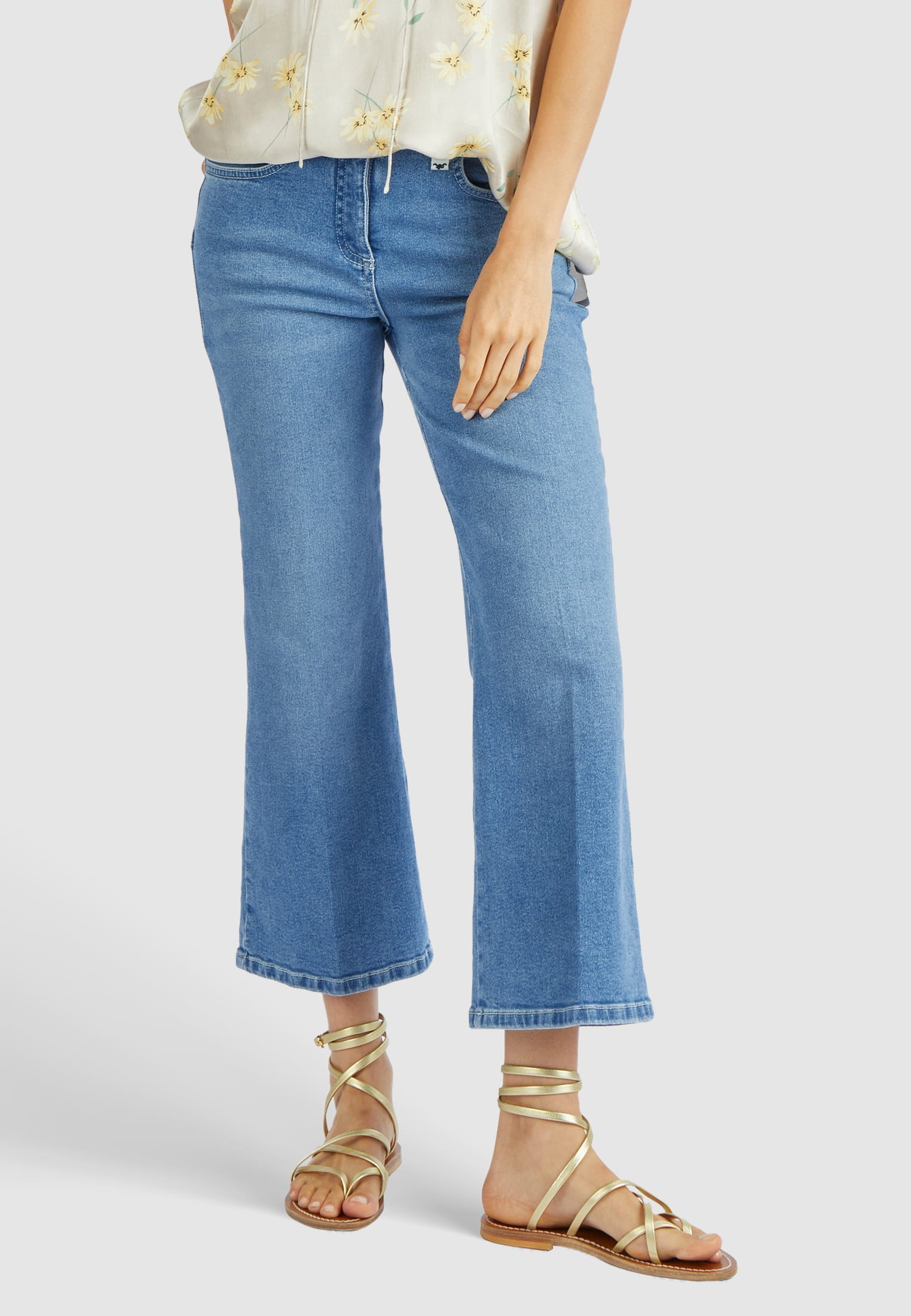 Укороченные расклешенные джинсы облегающего кроя из высококачественного денима с долей эластичности удобно прилегают к коже. Накладные задние карманы с эффектом пуш-ап оптимально подчеркивают изгибы. Джинсы имеют модную дополнительную длину с расклешенной ногой, которая характеризует расклешенный образ. Дизайн с 5 карманами структурирует джинсы и расставляет акценты.