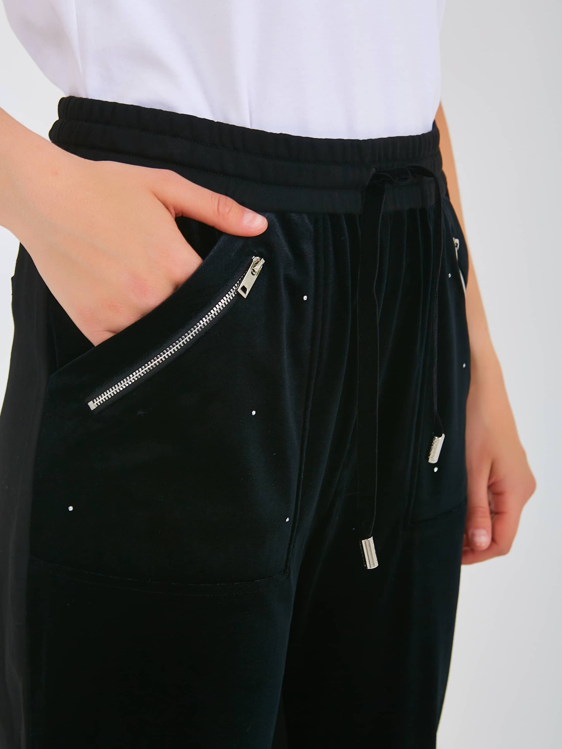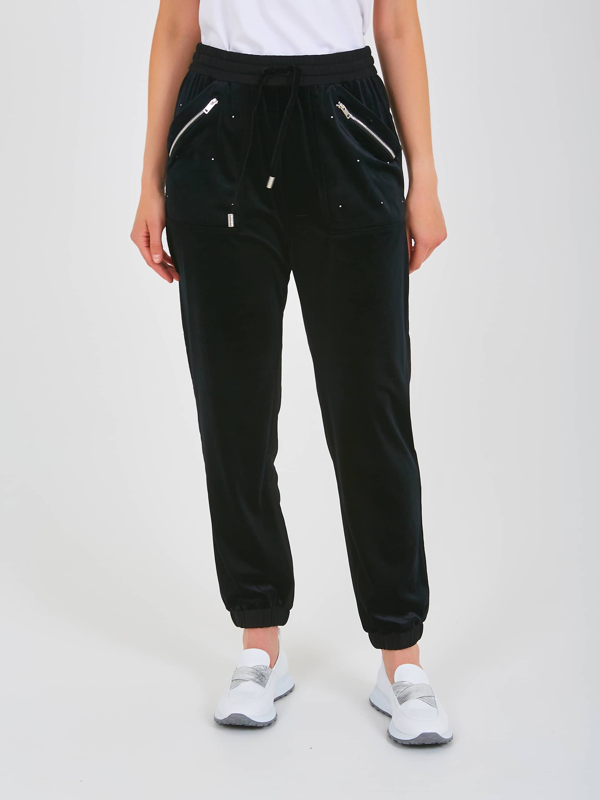 Спортивные брюки с завышенной талией длиной до щиколотки без застежки, дизайнерская особенность – использование двух разных по фактуре материалов, один из которых создает имитацию «звездного неба». На передних половинках расположены два кармана с отрезным бочком – имитация накладных карманов и декоративными молниями. На задних половинках брюк расположены карманы с листочкой. Верх брюк обработан поясом на резинке со шнуром для регулировки объема и металлическими наконечниками. Низ брюк присборен на манжету.