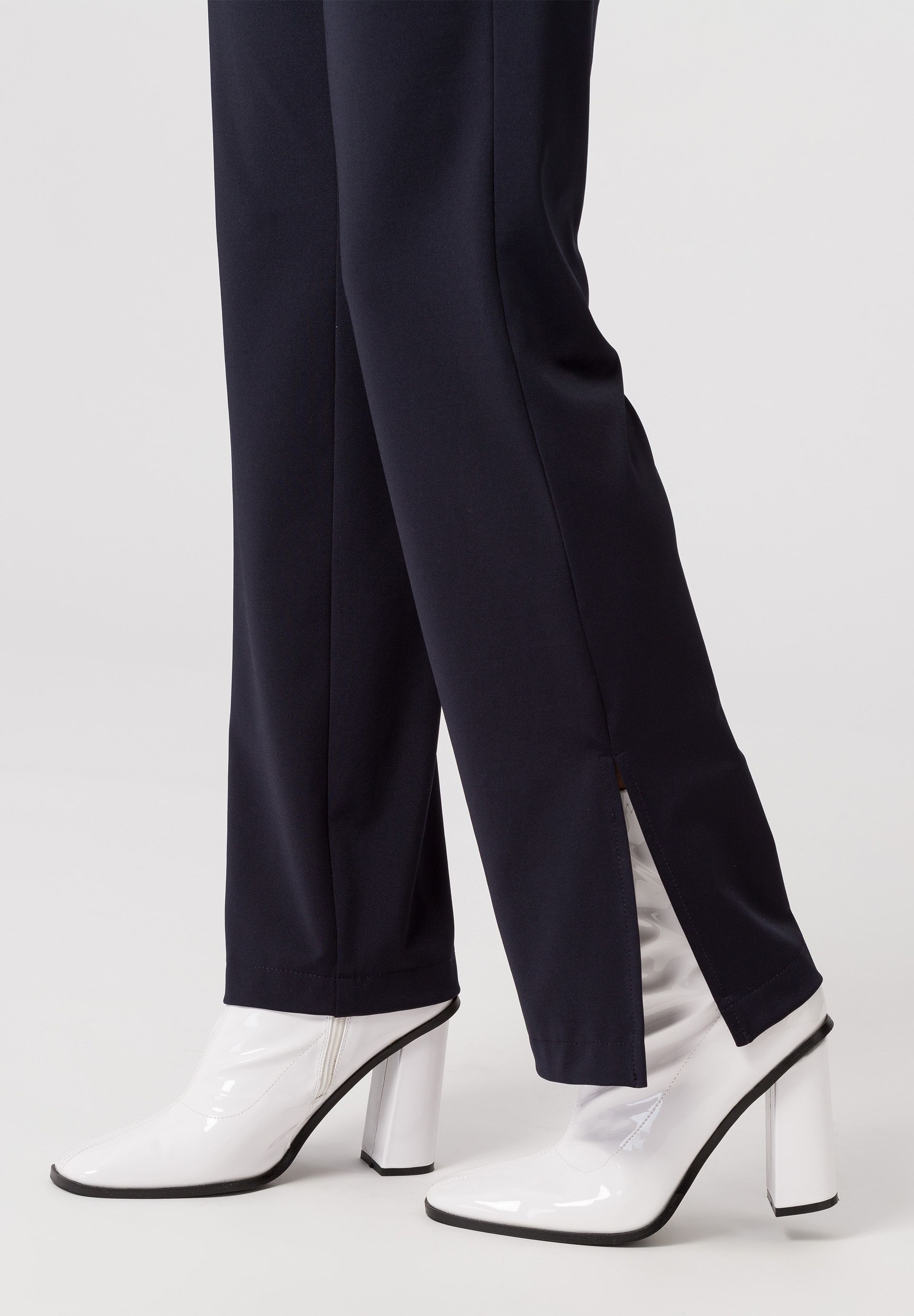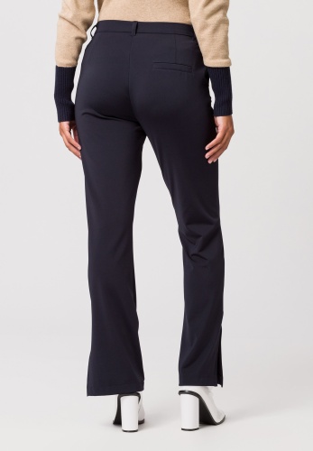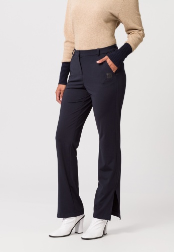 Брюки женские с декоративным прорезным карманом сзади. Прямые брючины облегают фигуру, эластичный трикотаж, за которым легко ухаживать, имеет струящуюся драпировку и мягкий на ощупь. Вневременной однотонный образ дополнен изящным принтом на левом кармане брюк