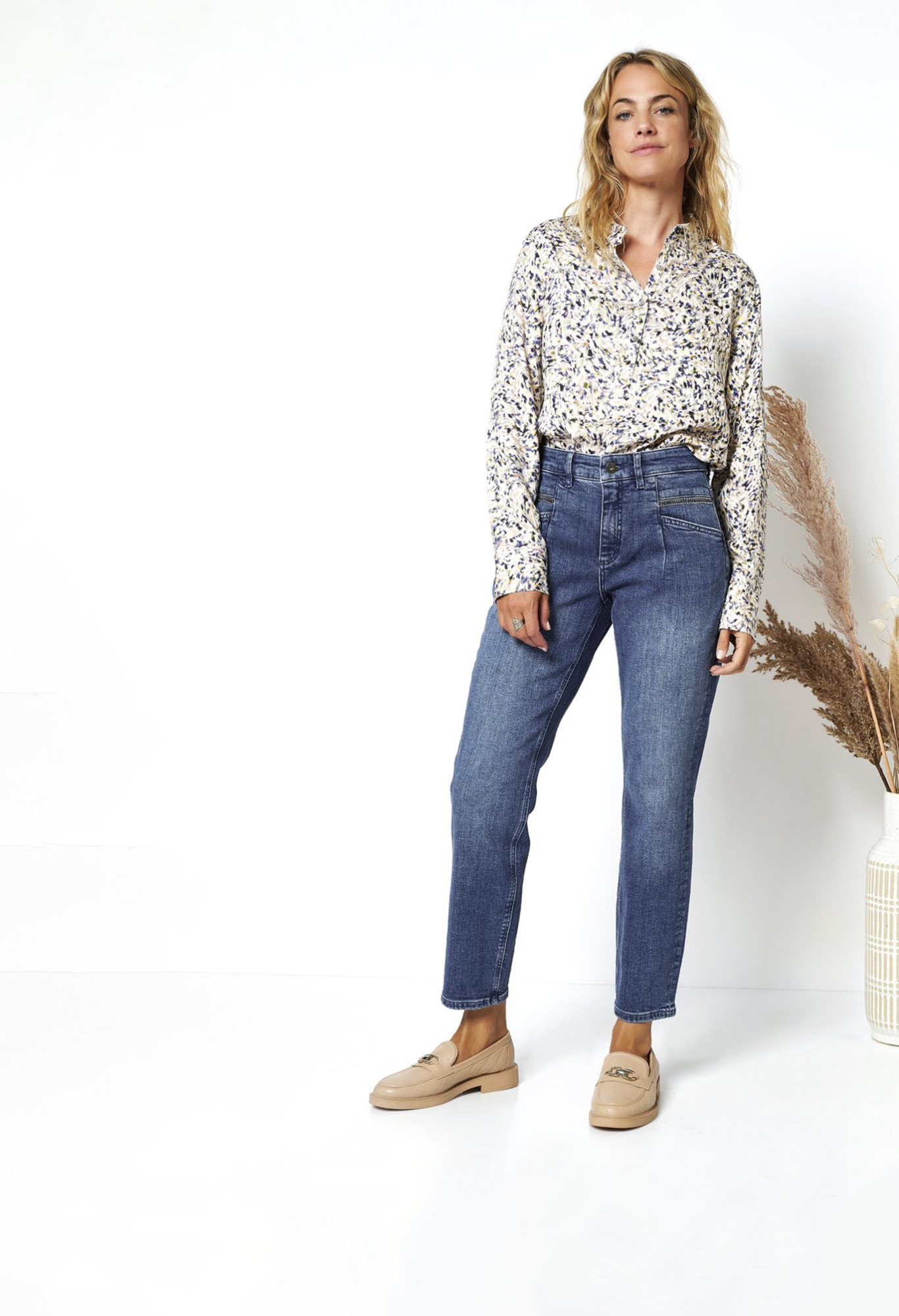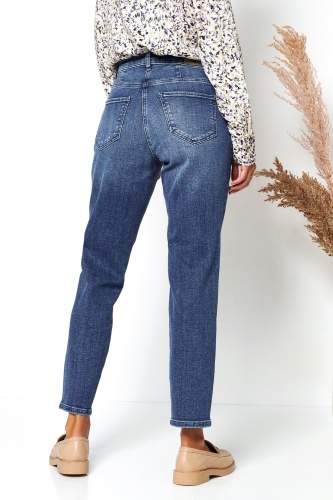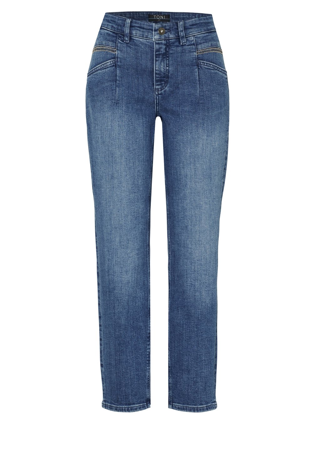 Джинсы прямого кроя с металлическими пластинами и вытачками в качестве деталей из стираного денима, слегка укороченной длины.
