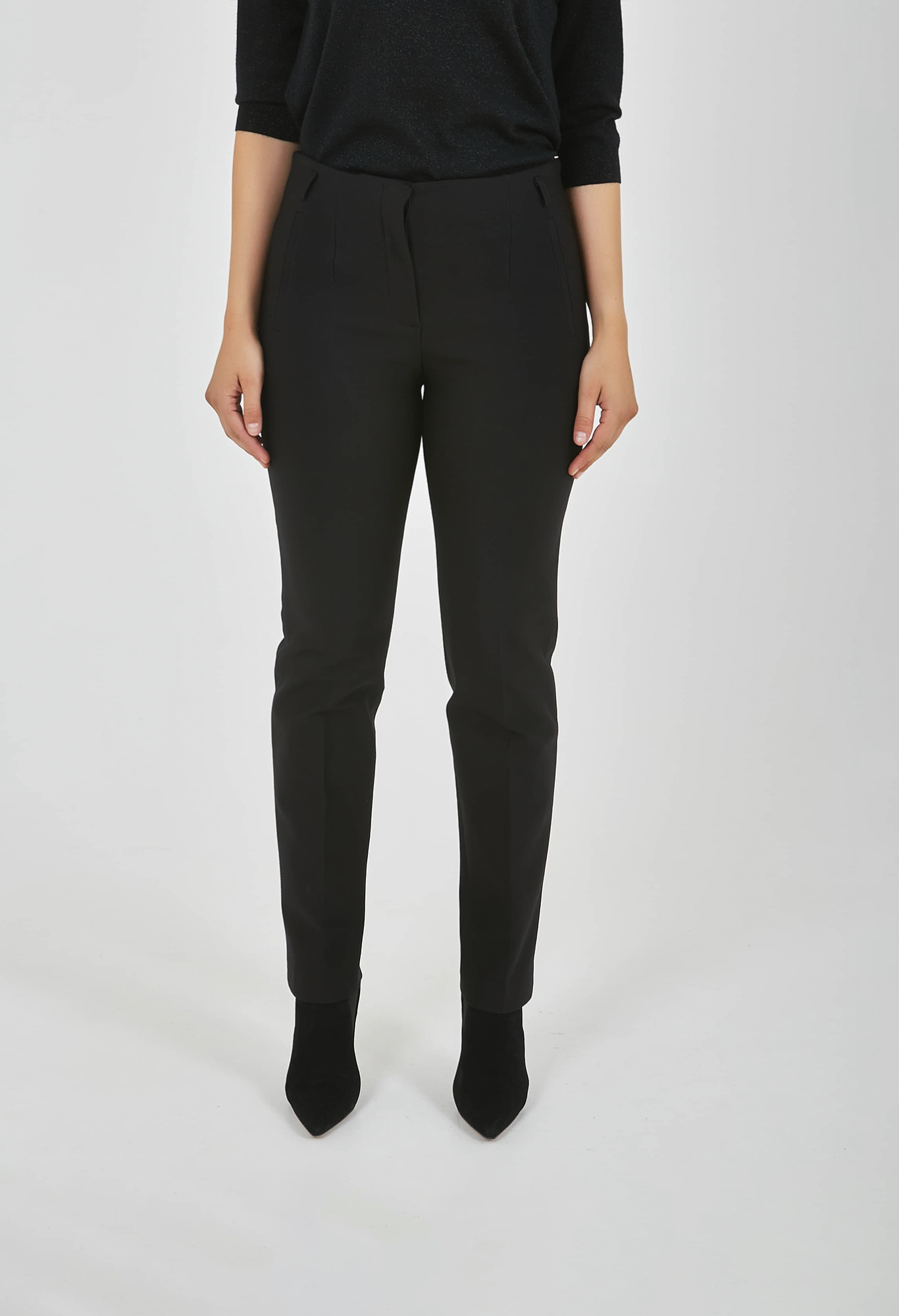 Длинные прямые брюки, с застежкой на молнию и крючок. Брюки зауженные к низу. На передних половинках расположены два кармана с листочкой. На задних половинках также расположены два кармана с листочкой. Верх брюк обработан обтачкой и шлевками.