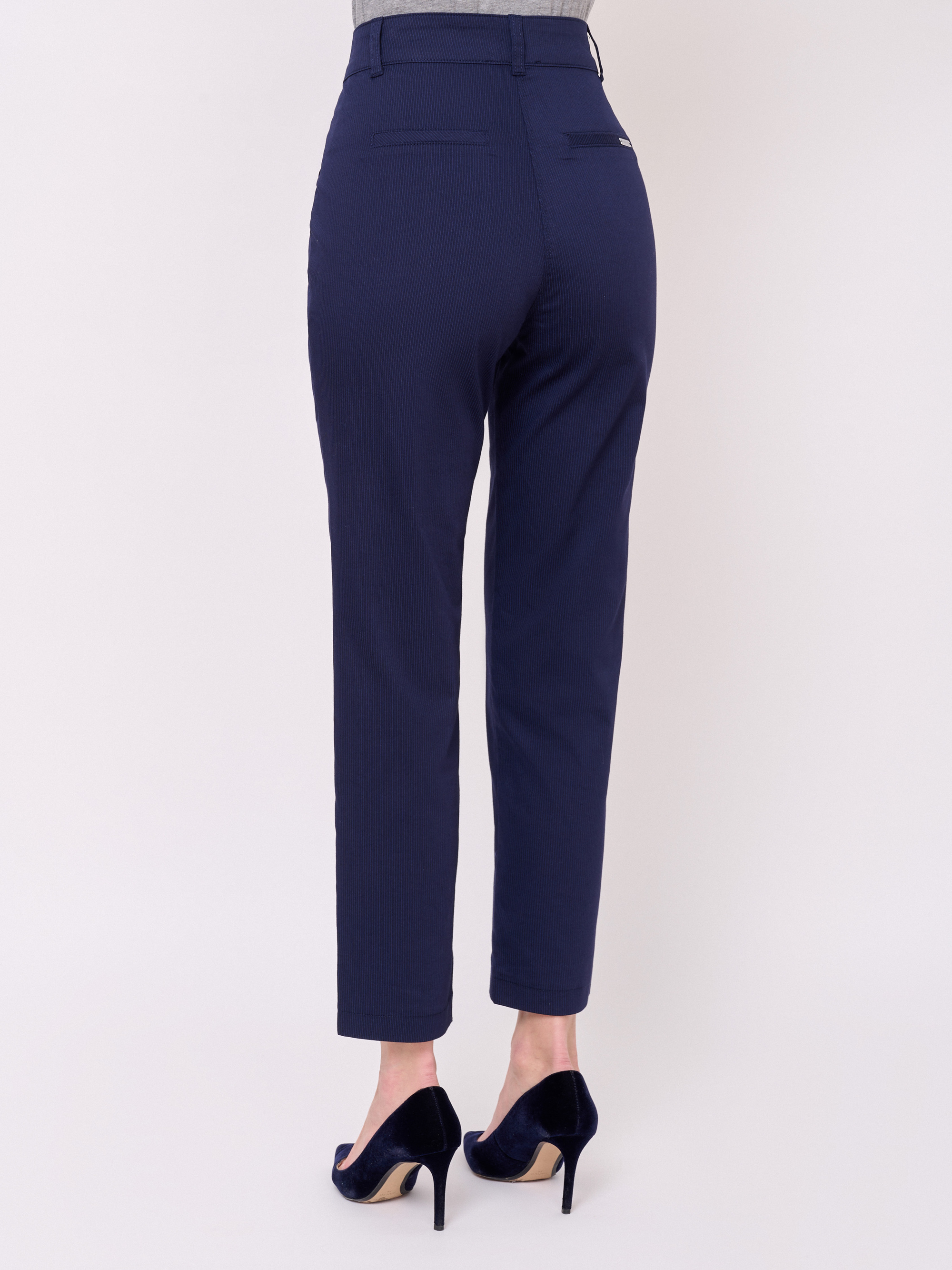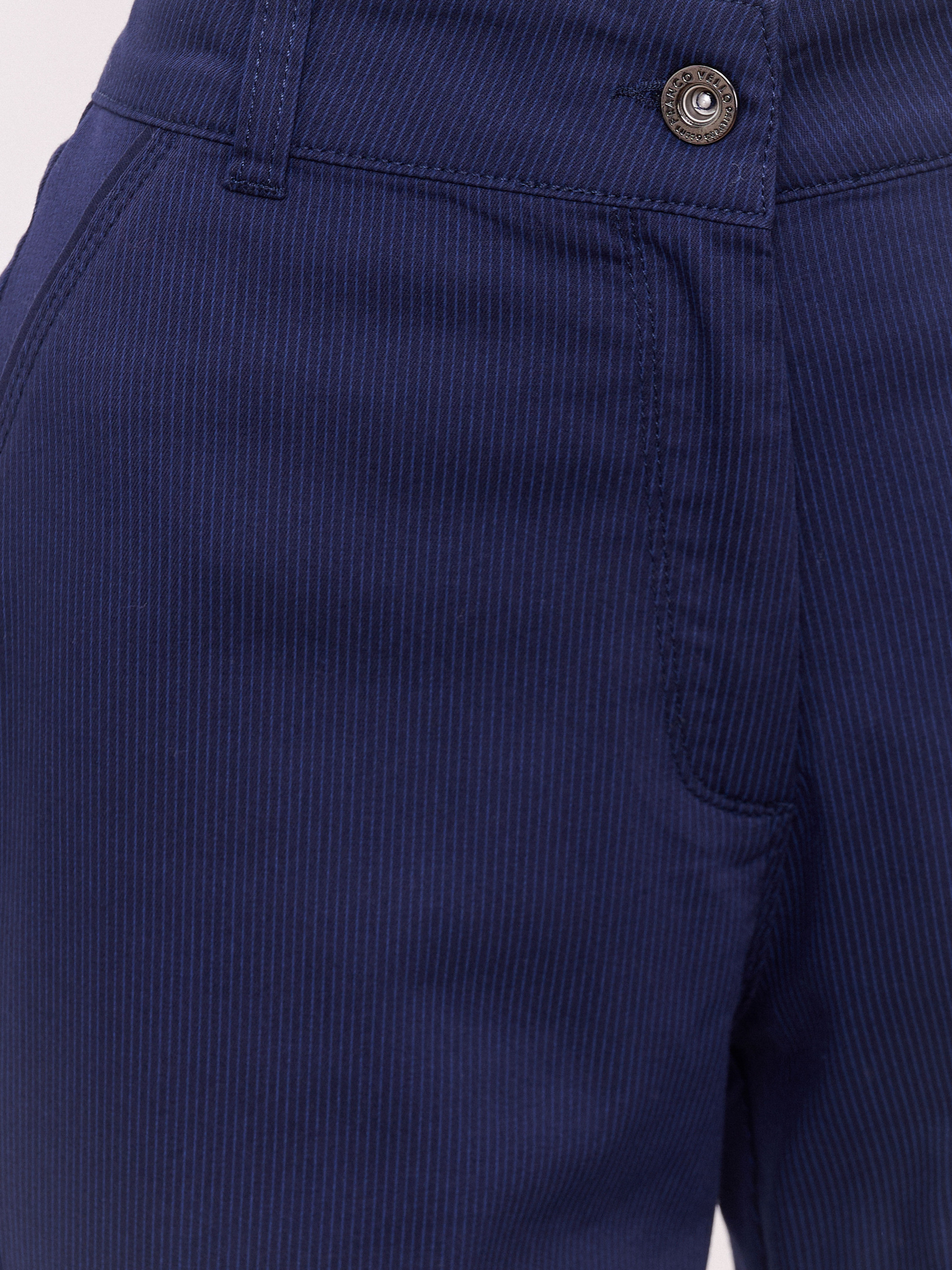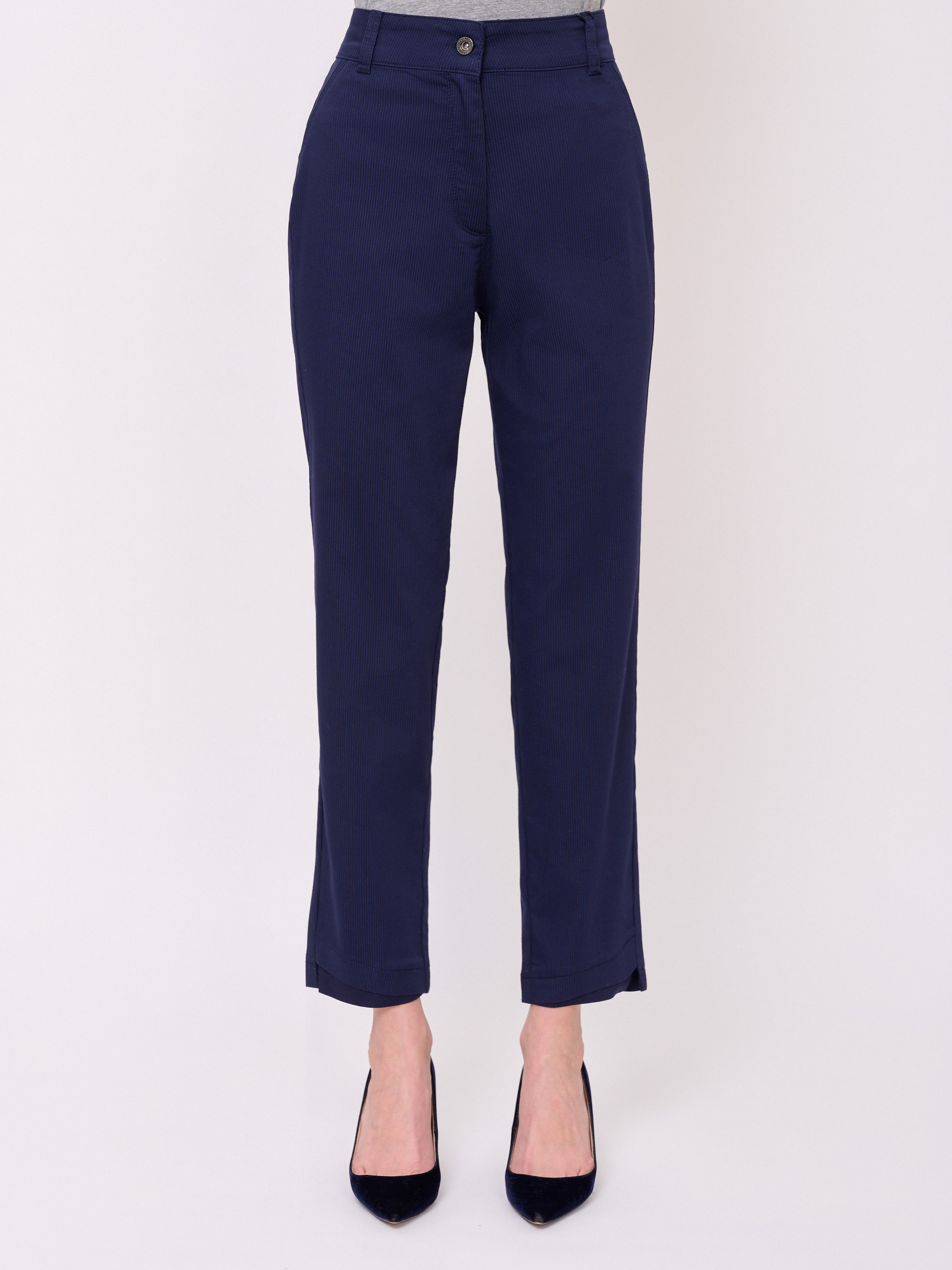 Застежка молния, рисунок полоска, карманы косые, крой брючин прямой, посадка средняя, боковые разрезы. Длина брючин: 70 см.