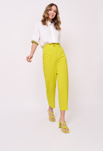 Застежка молния, без рисунка, без карманов, крой брючин слегка зауженный, посадка средняя, шлевки для ремня, высокий пояс. Длина брючин: 69 см.