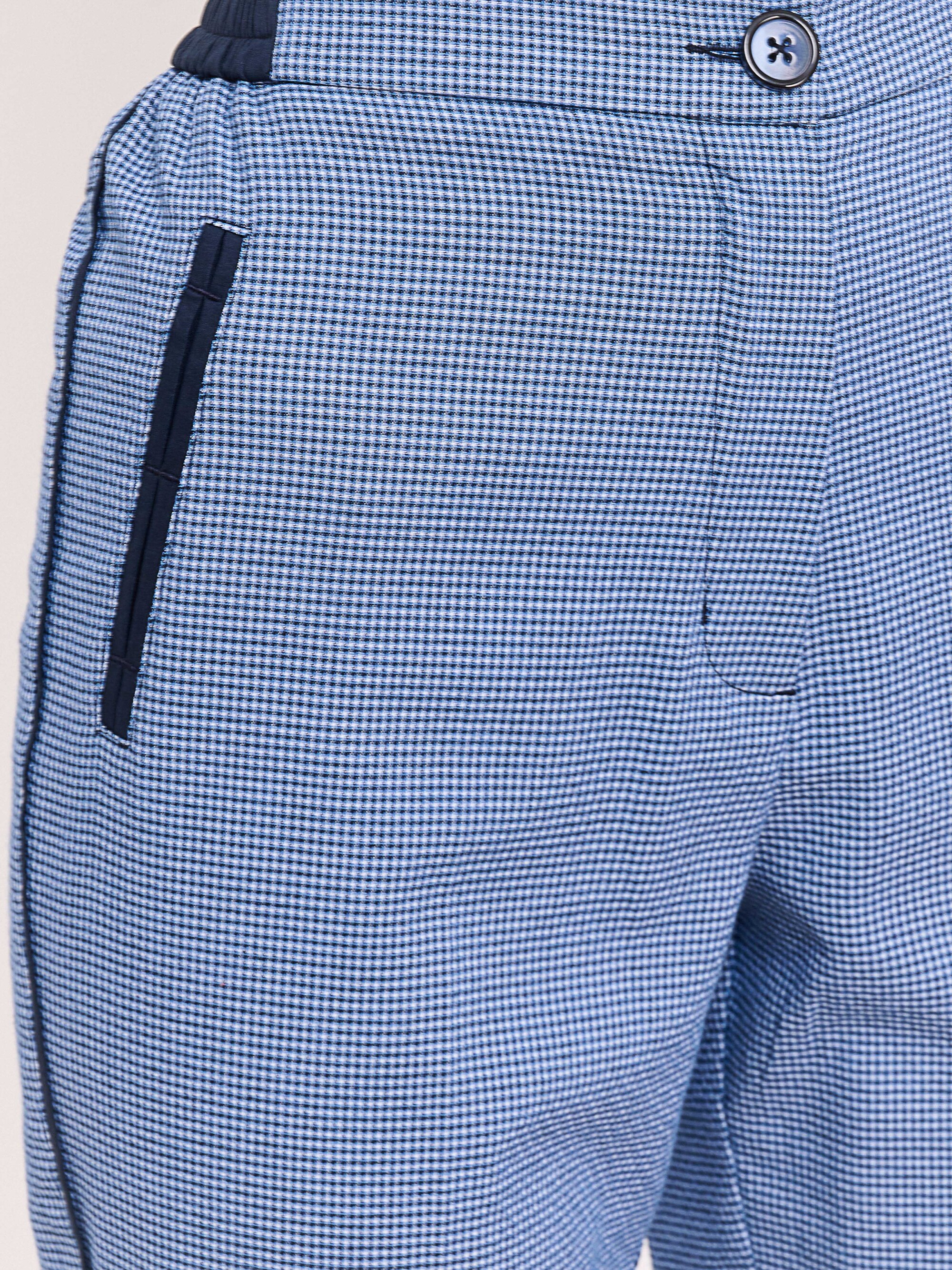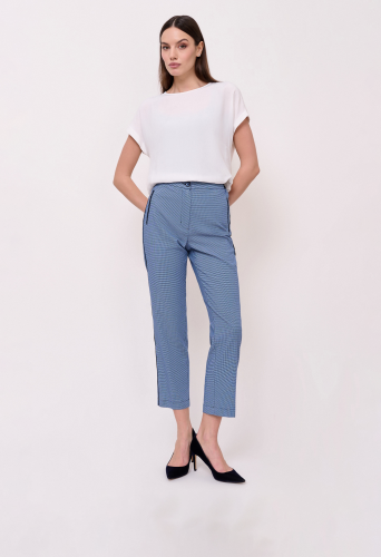 Детали: застежка молния, бокове эластичные вставки на поясе, рисунок клетка, без карманов, крой брючин зауженный, посадка средняя. Длина брючин: 70 см.