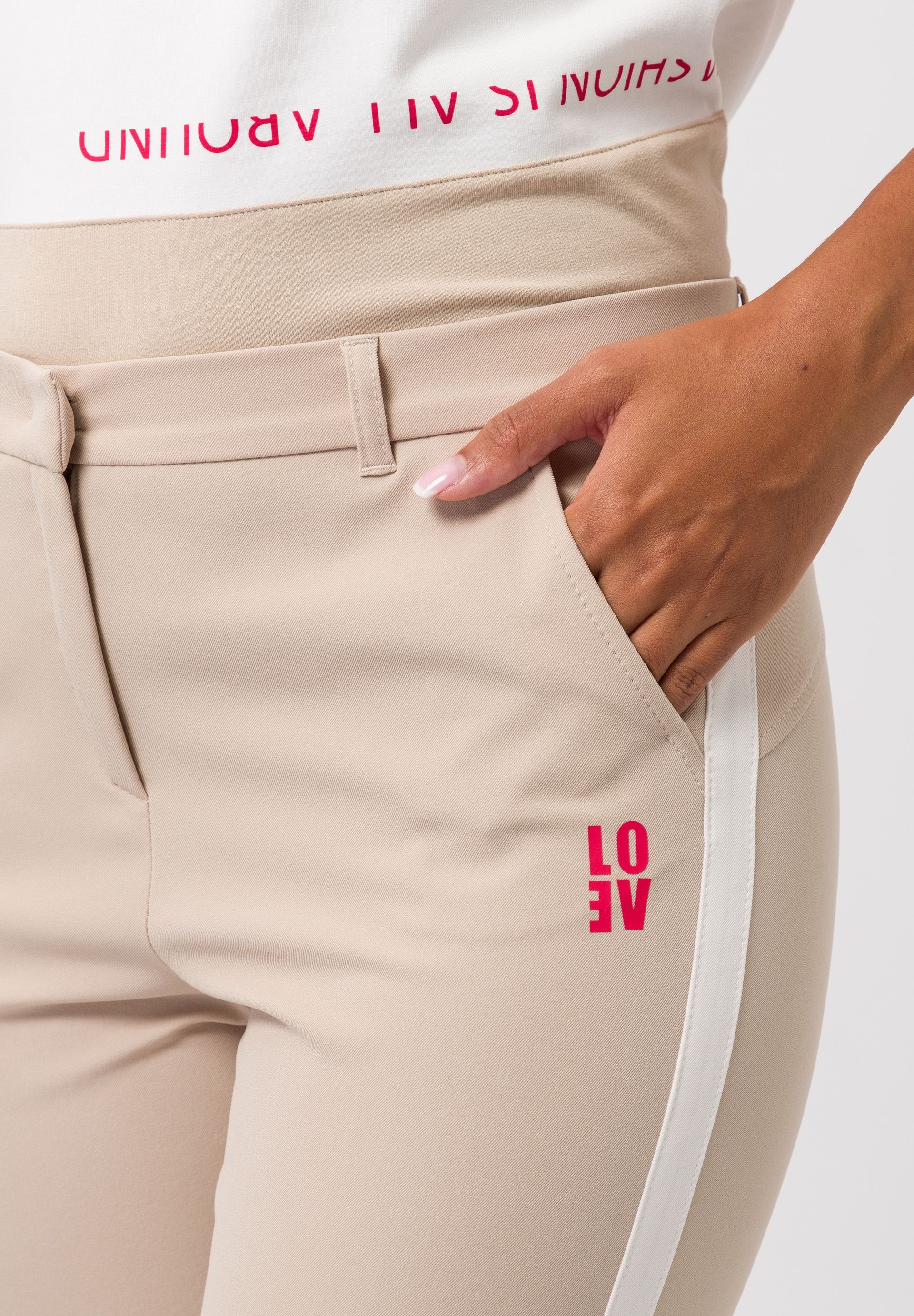 Брюки женские с контрастными полосками по бокам. Облегающий крой подчеркивает фигуру в сочетании с эластичной способностью сохранять форму. Это означает, что брюки очень удобно сидят на ноге в течение всего дня, сохраняя при этом свою форму. Потайная застежка на поясе с петлей для ремня обеспечивает чистоту спереди.