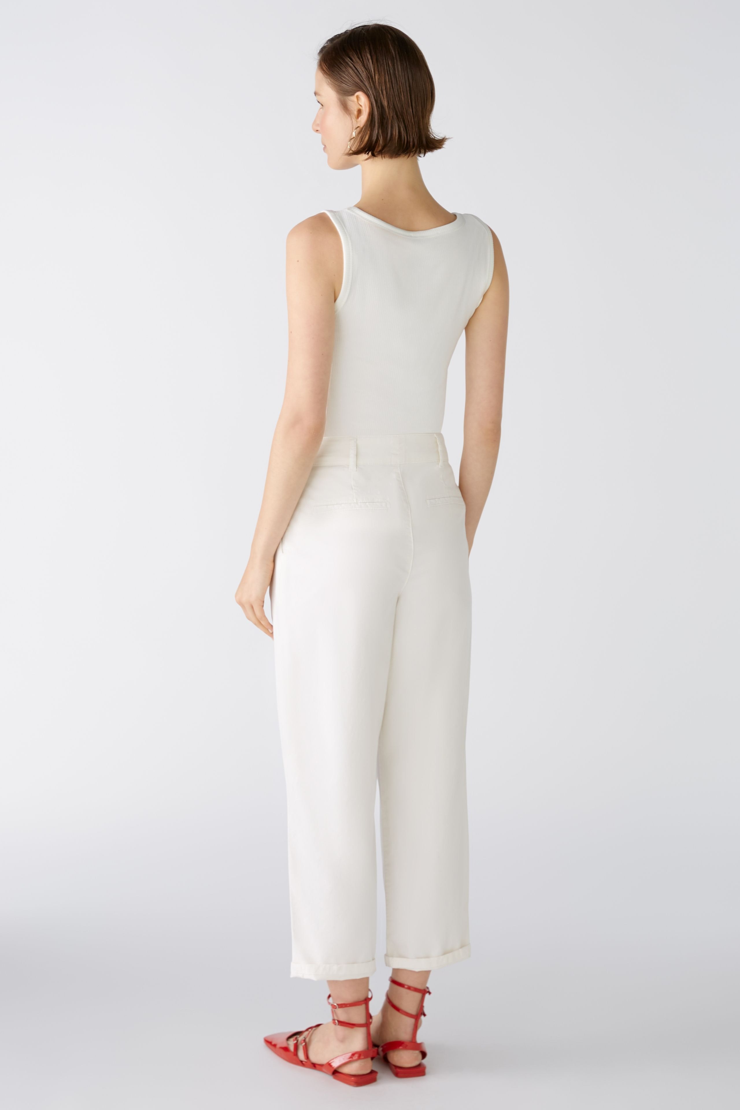 Повседневные брюки из смеси эластичных натуральных материалов - смесь хлопка-лиоцелла с эластаном. Талия средней высоты, штанины сужаются к низу, укороченная длина. С молнией и пуговицей с логотипом, петлями для ремня. Боковые карманы, ложные прорезные карманы сзади. Длина для размера 42: 68 см.