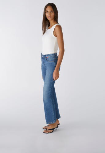 Эластичная смесь хлопка, аутентичная стирка среднего синего цвета. Средняя талия, стандартная длина, модный расклешенный крой. С молнией и пуговицей с логотипом, петлями для ремня. Типичные сумки с пятью карманами. Любимая деталь: маленькая вышивка в виде сердечек на сумке. Эластомультиэстер с превосходными свойствами растяжения и отскока. Длина для размера 36: 80 см.