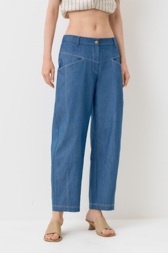 Брюки свободные по бедрам чуть заужены книзу с помощью вытачек. Пояс из двух частей, задняя часть собрана на резинку. Пять настрочных шлевок. Застежка гульфик на молнию, пояс- на кнопку-пуговицу (болт). Передняя половинка с кокеткой, разрезающей гульфик под углом. Боковой карман. Задняя половинка с заниженной кокеткой. Имитация задних карманов, выходящих из под кокетки, обозначена двойной отделочной строчкой контрастными нитками. Все отделочные строчки выполнены контрастными нитками.