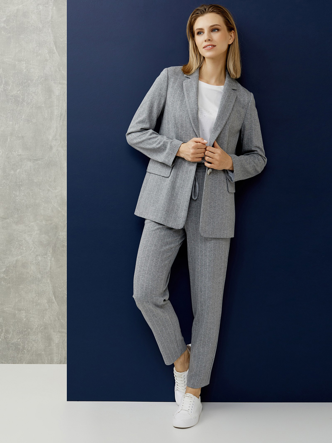 Однотонные серые брюки прямого кроя в полоску. Эластичный пояс с кулиской обеспечивают комфортную посадку и удобство ношения. Брюки – идеальный вариант низа для повседневного образа, сочетаются как с футболкой или джемпером, так и с жакетом в тон.
