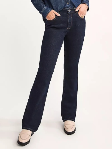 Темные однотонные джинсы-клеш с высокой посадкой. Без декоративных потертостей и складок. Классические пять карманов, притачной пояс со шлевками. Трендовая модель джинсов для создания актуального образа! Хорошо сочетаются с заправленной рубашкой или джемпером.