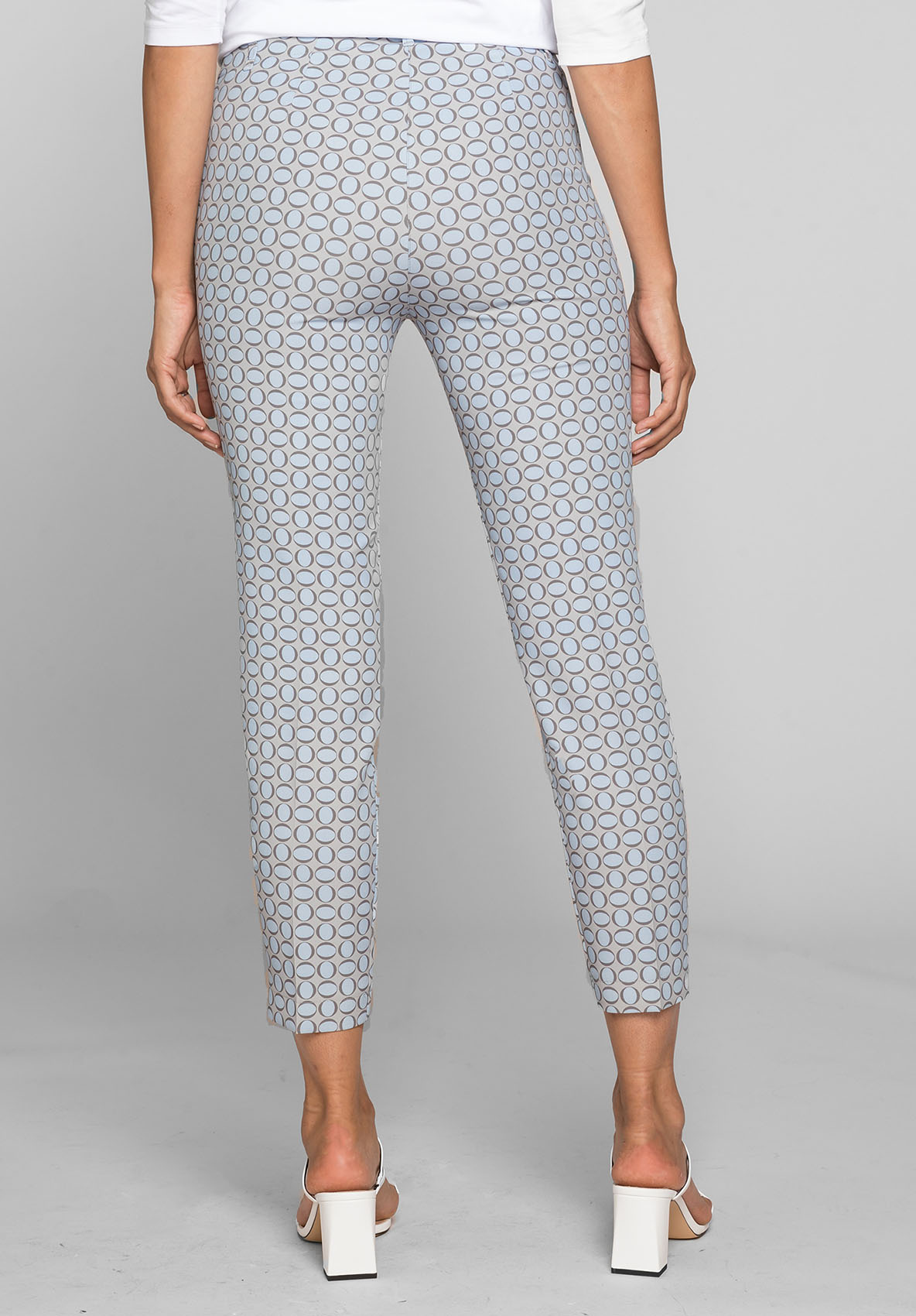Эластичные брюки Siena с трендовым геометрическим принтом являются изюминкой коллекции марки Bianca. Эластичный материал повторяет движения тела и очень удобен в носке. Данная модель брюк имеет силуэт slim, среднюю посадку, длину 7/8 и пояс со шлевками. Брюки станут идеальной парой как для стильного образа. • брюки с голубым принтом в полоску • высококачественный материал • застежка-молния, небольшие разрезы по бокам • средняя посадка, силуэт slim • длина около 68 см, 7/8