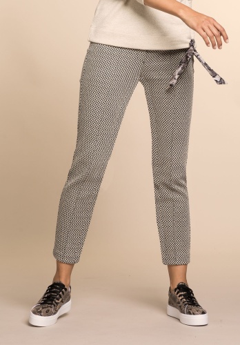Бежевые джеггинсы Denver с геометрическим узором являются абсолютным законодателем моды. Благодаря высокому проценту эластичных материалов в составе и широкому поясу с декоративной лентой трикотажные брюки очень удобны и являются отличным выбором на каждый день. В сочетании с легкой толстовкой или футболкой брюки создают завершенный образ в стиле кэжуал. • трикотажные жаккардовые брюки с тонкими полосками по бокам • смесь хлопка, вискозы и эластана • широкий пояс с декоративной лентой • укороченные брюки 7/8, рост модели - 180 см • длина около 72 см
