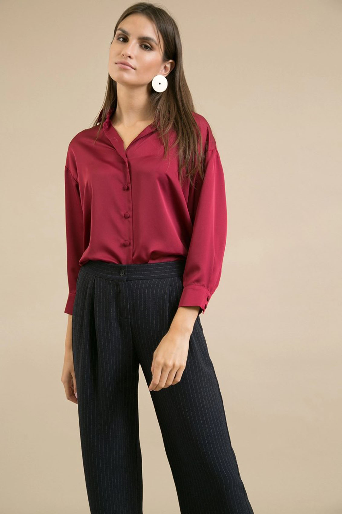 Темно-синие брюки в полоску. Модель свободного кроя, имеет высокую посадку, притачной пояс, боковые вертикальные карманы. Спереди расположен гульфик классической формы, застегивается на потайную молнию и пуговицу. У карманов штанины драпированы складками. Элегантная модель для создания делового образа.