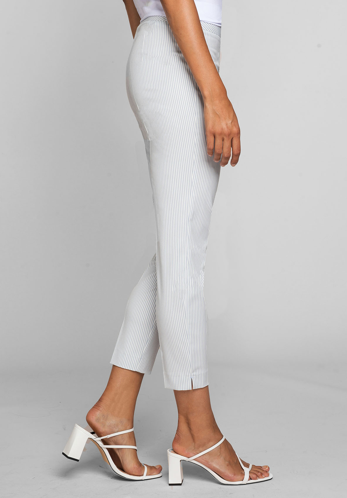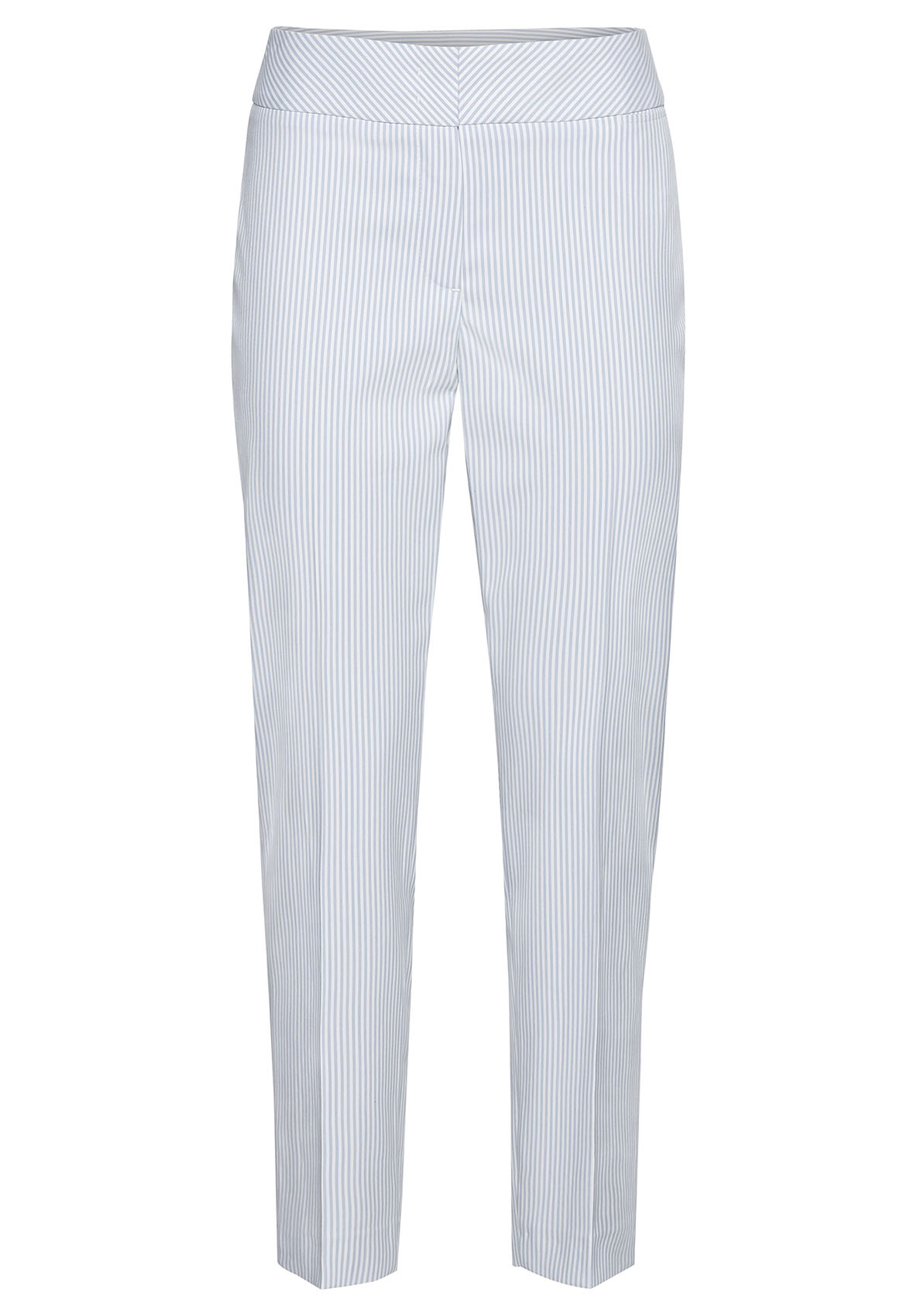 Эластичные брюки Siena с трендовым принтом в полоску. Брюки отлично подходят для стильного образа. Эластичный материал очень удобен в ношении. Данная модель имеет силуэт slim, среднюю посадку, длину 7/8, высокий пояс со скрытой застежкой и небольшой карман под поясом. Брюки станут идеальной модной парой как для делового, так и для повседневного образа. • брюки с принтом в полоску • высококачественная смесь вискозы и эластана • застежка-молния, небольшие разрезы по бокам • средняя посадка, силуэт slim • укороченные брюки 7/8, длина около 68 см