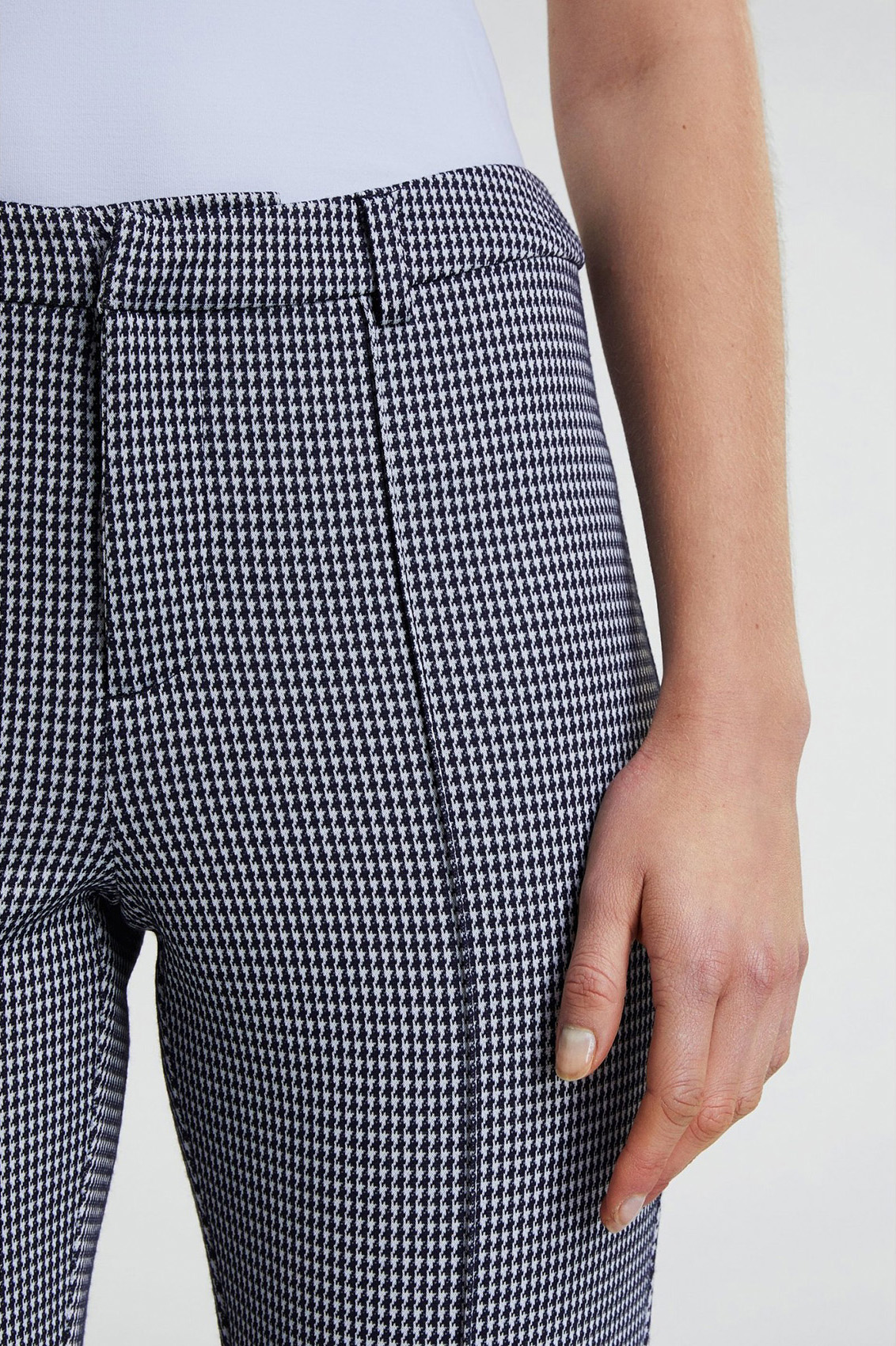 Прямые брюки средней посадки - совсем не скучная модель! Укороченная длина брюк позволяет продемонстрировать модную обувь. Стрелки делают образ более строгим. Классический клетчатый орнамент "гусиная лапка" является одним из современных трендов. В сочетании с лаконичным верхом эти брюки станут модным акцентом в вашем образе.