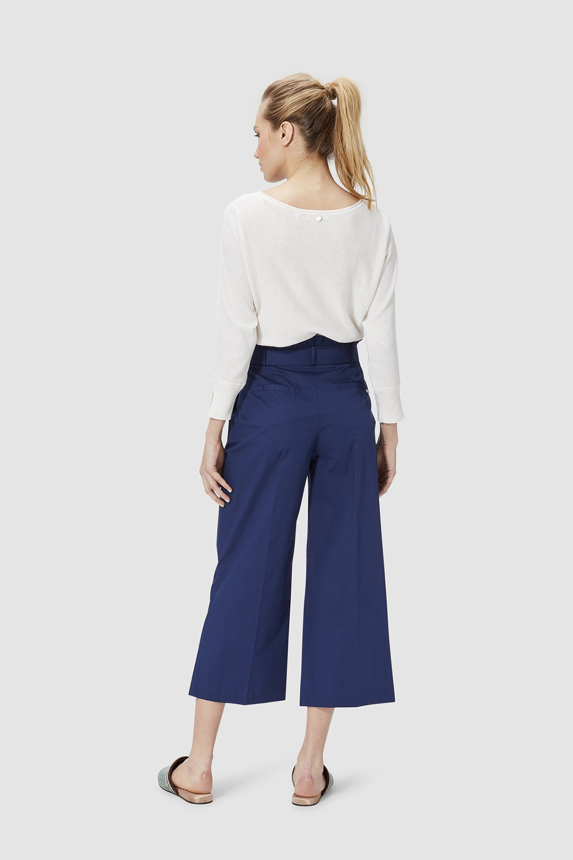 Кюлоты из легкого хлопкового поплина подчеркивают женственный силуэт. Их укороченная длина и отделка на поясе делает образ стильным и современным. Высокая талия, защипы, два боковых и два прорезных кармана. С белыми кроссовками и футболкой создается безупречный наряд на каждый день.