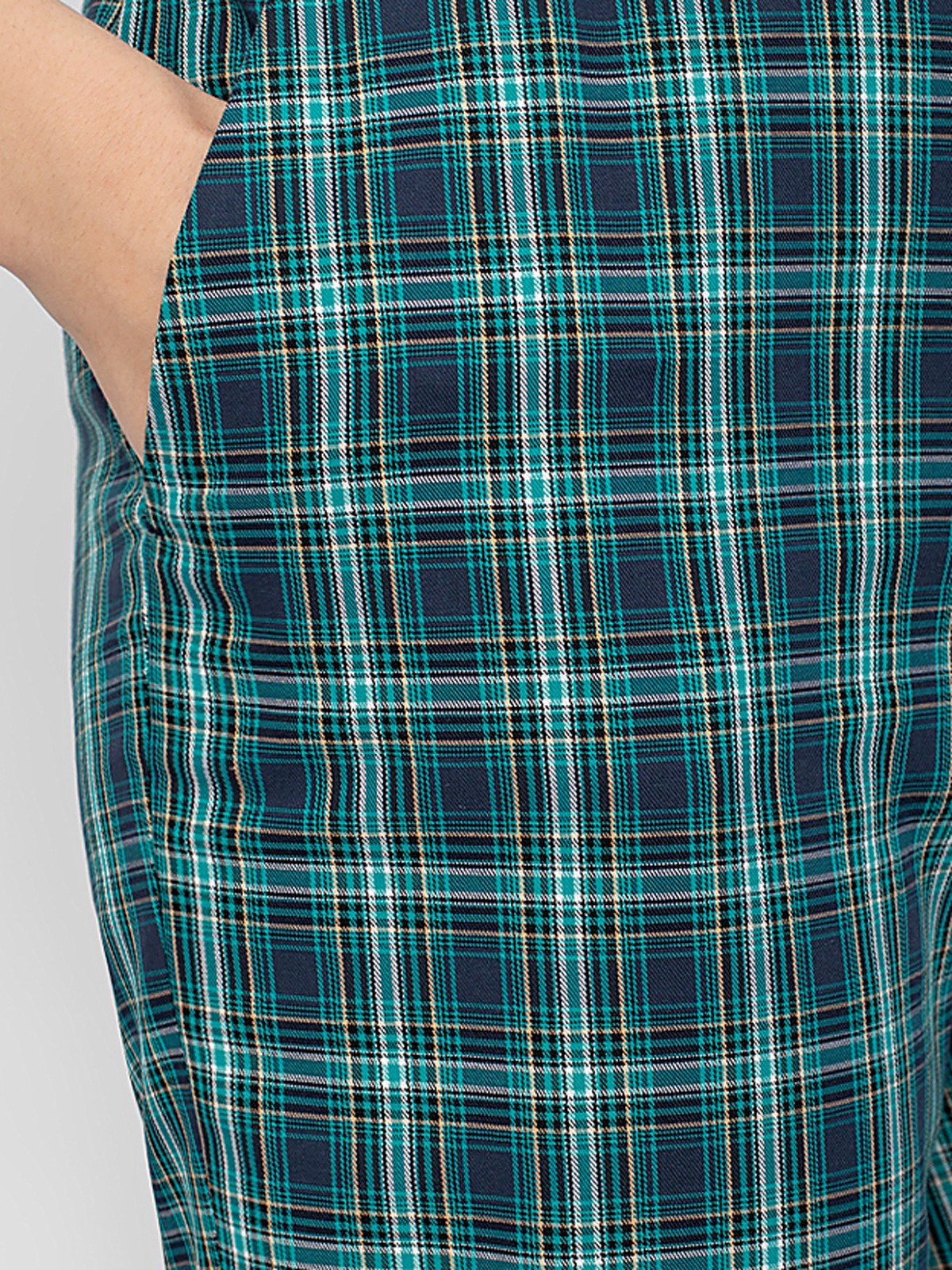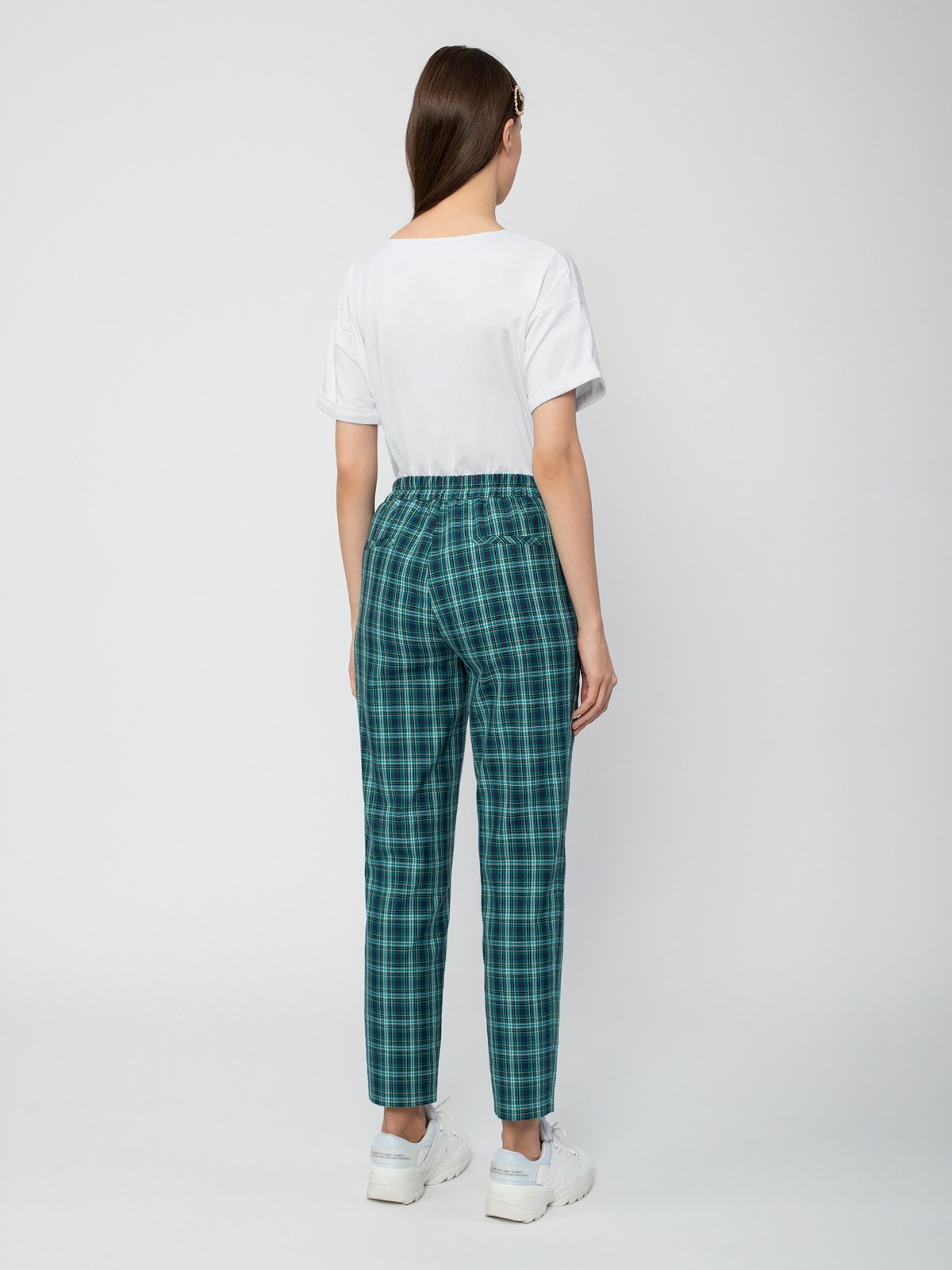 Брюки из костюмной ткани в клетку прямого силуэта зауженного к низу на притачном поясе с боковыми карманами.