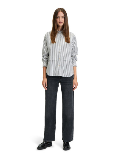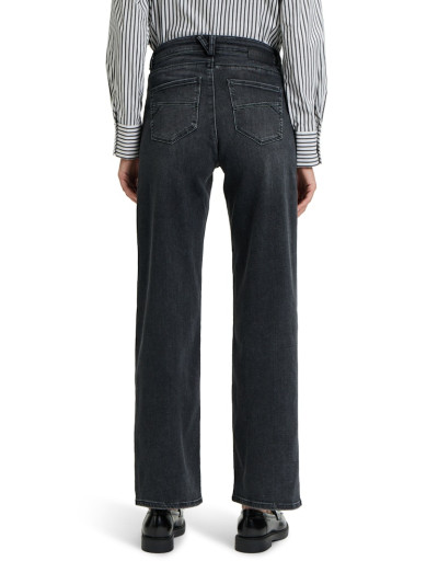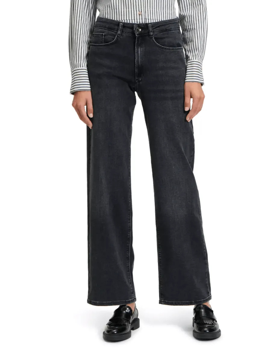 Элегантные темные джинсы с широким силуэтом, выполненные из мягкого денима, обеспечивают комфорт и универсальность, идеально сочетаясь с рубашками и свитерами для создания стильных образов.